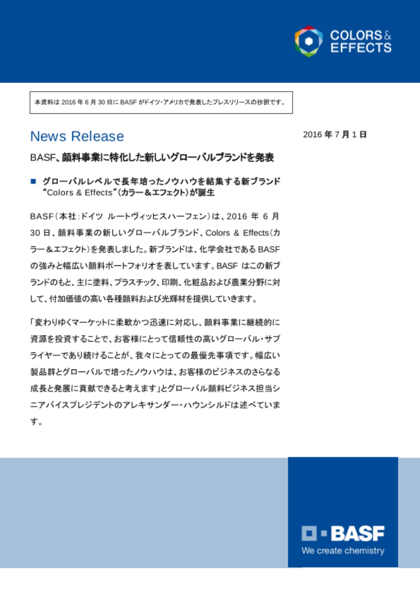 ( 本資料は 2016年6月30日にBASFがドイツ・アメリカで発表したプレスリリースの抄訳です。)