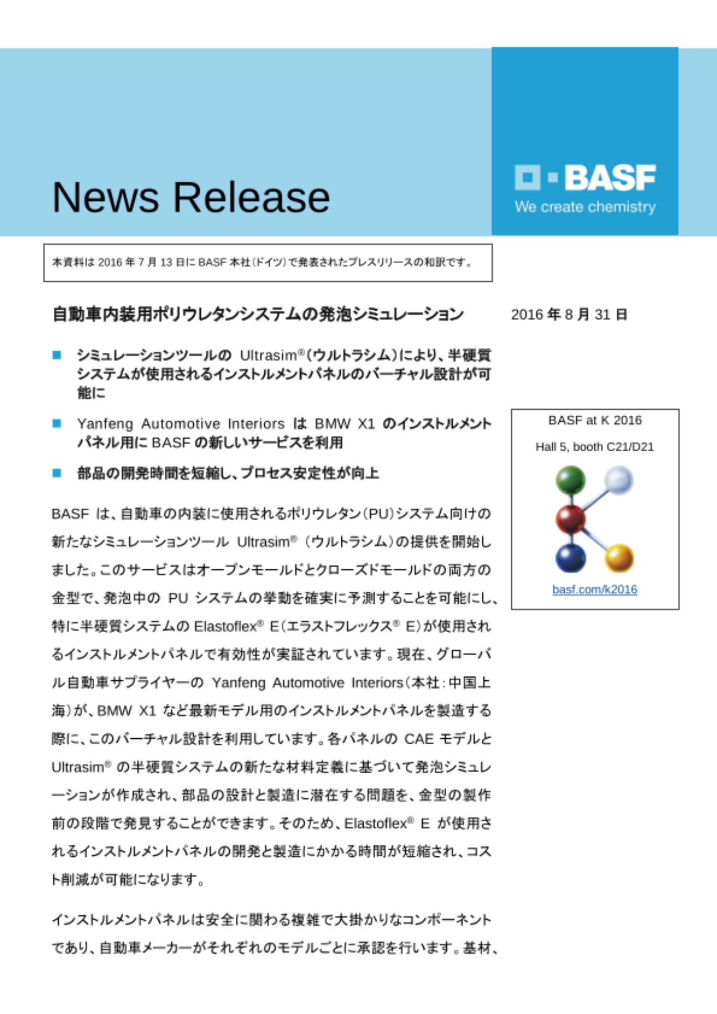 BASFは、自動車の内装に使用されるポリウレタン(PU)システム向けの新たなシミュレーションツールUltrasim® (ウルトラシム)の提供を開始しました。このサービスはオープンモールドとクローズドモールドの両方の金型で、発泡中のPUシステムの挙動を確実に予測することを可能にし、特に半硬質システムのElastoflex® E(エラストフレックス® E)が使用されるインストルメントパネルで有効性が実証されています。現在、グローバル自動車サプライヤーのYanfeng Automotive Interiors(本社:中国上海)が、BMW X1など最新モデル用のインストルメントパネルを製造する際に、このバーチャル設計を利用しています。各パネルのCAEモデルとUltrasim® の半硬質システムの新たな材料定義に基づいて発泡シミュレーションが作成され、部品の設計と製造に潜在する問題を、金型の製作前の段階で発見することができます。そのため、Elastoflex® Eが使用されるインストルメントパネルの開発と製造にかかる時間が短縮され、コスト削減が可能になります。