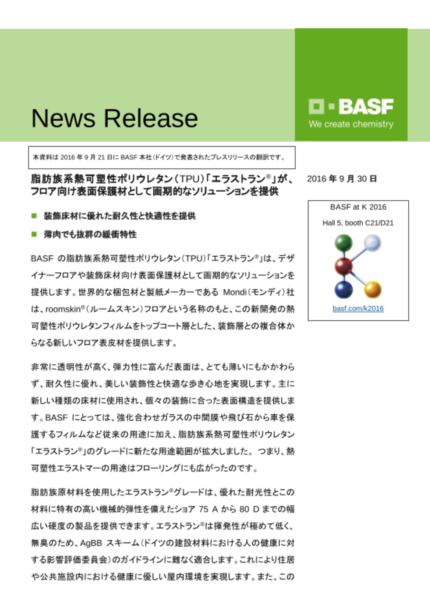 アイデアを理想的ソリューションに:BASFは、2016年10月19日~26日にドイツのデュッセルドルフで開催されるK fair(国際プラスチック・ゴム産業展)に出展します(第5ホール、C21/D21ブース)。関連プレスリリース、画像、詳細情報は、basf.com/k2016でご覧ください。