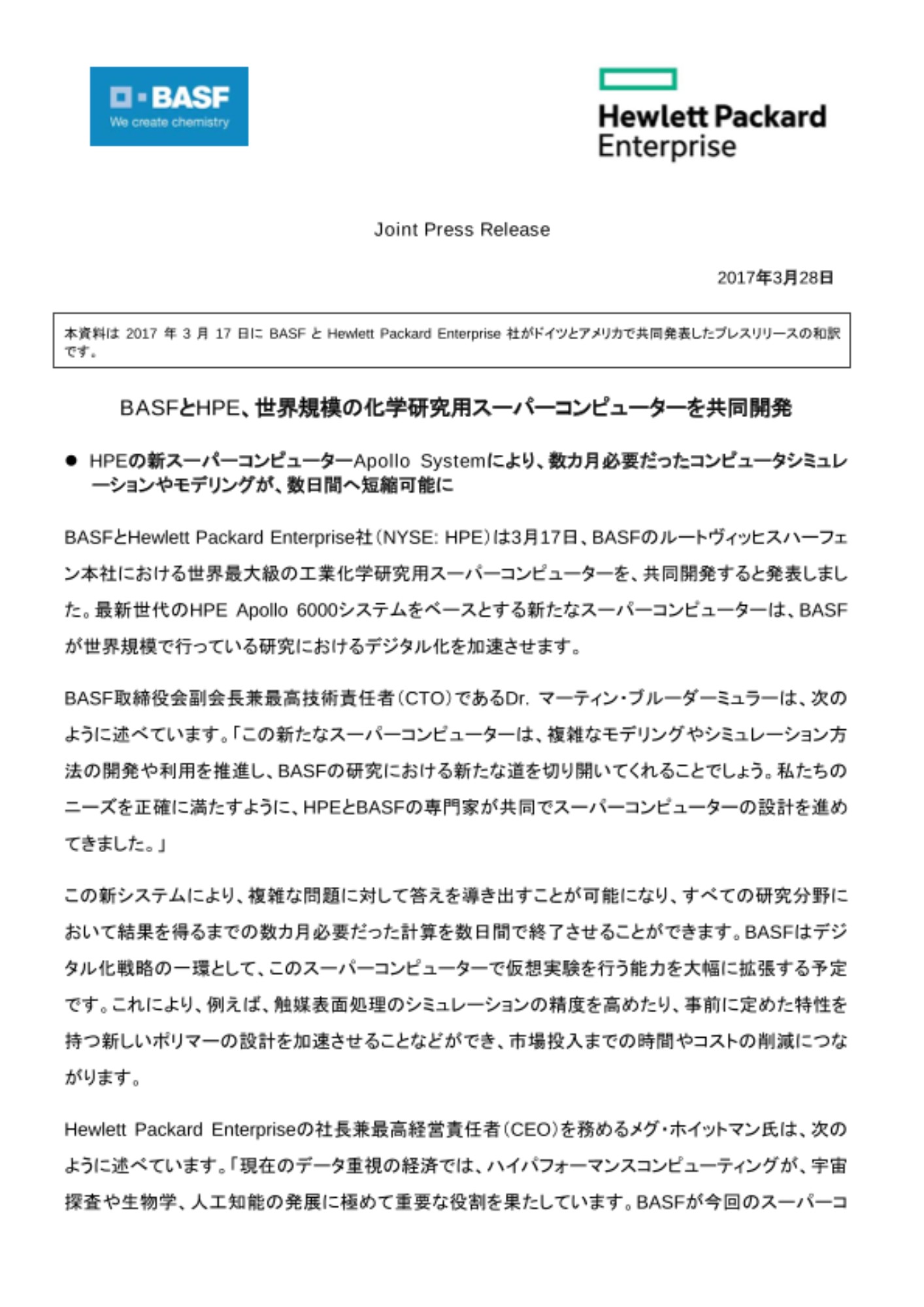 (本資料は 2017 年3月17日に BASFとHewlett Packard Enterprise社がドイツとアメリカで共同発表したプレスリリースの和訳です。)