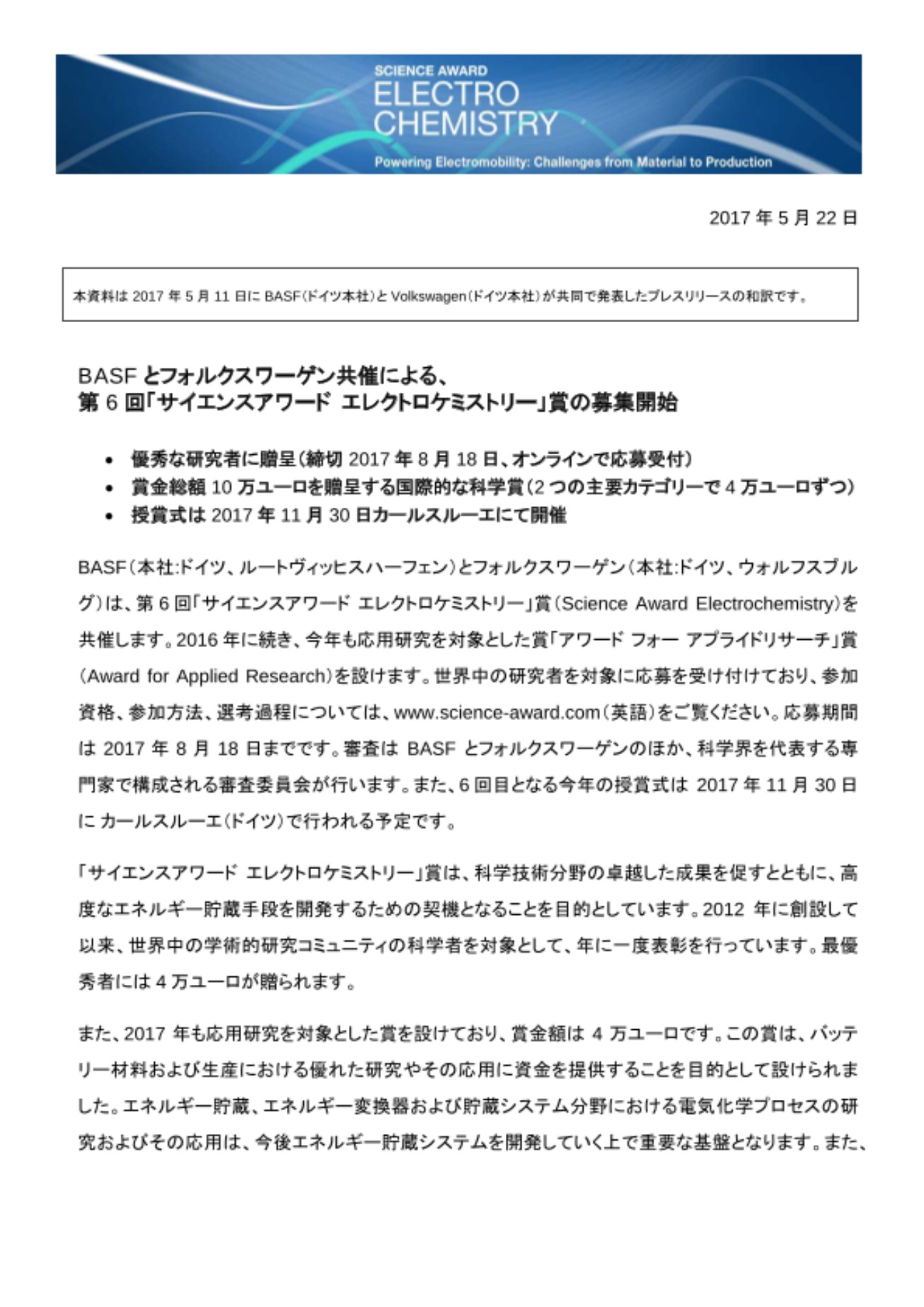 BASF(本社:ドイツ、ルートヴィッヒスハーフェン)とフォルクスワーゲン(本社:ドイツ、ウォルフスブルグ)は、第6回「サイエンスアワード エレクトロケミストリー」賞(Science Award Electrochemistry)を共催します。2016年に続き、今年も応用研究を対象とした賞「アワード フォー アプライドリサーチ」賞(Award for Applied Research)を設けます。世界中の研究者を対象に応募を受け付けており、参加資格、参加方法、選考過程については、www.science-award.com(英語)をご覧ください。応募期間は2017年8月18日までです。審査は BASF とフォルクスワーゲンのほか、科学界を代表する専門家で構成される審査委員会が行います。また、6回目となる今年の授賞式は 2017年11月30日に カールスルーエ(ドイツ)で行われる予定です。