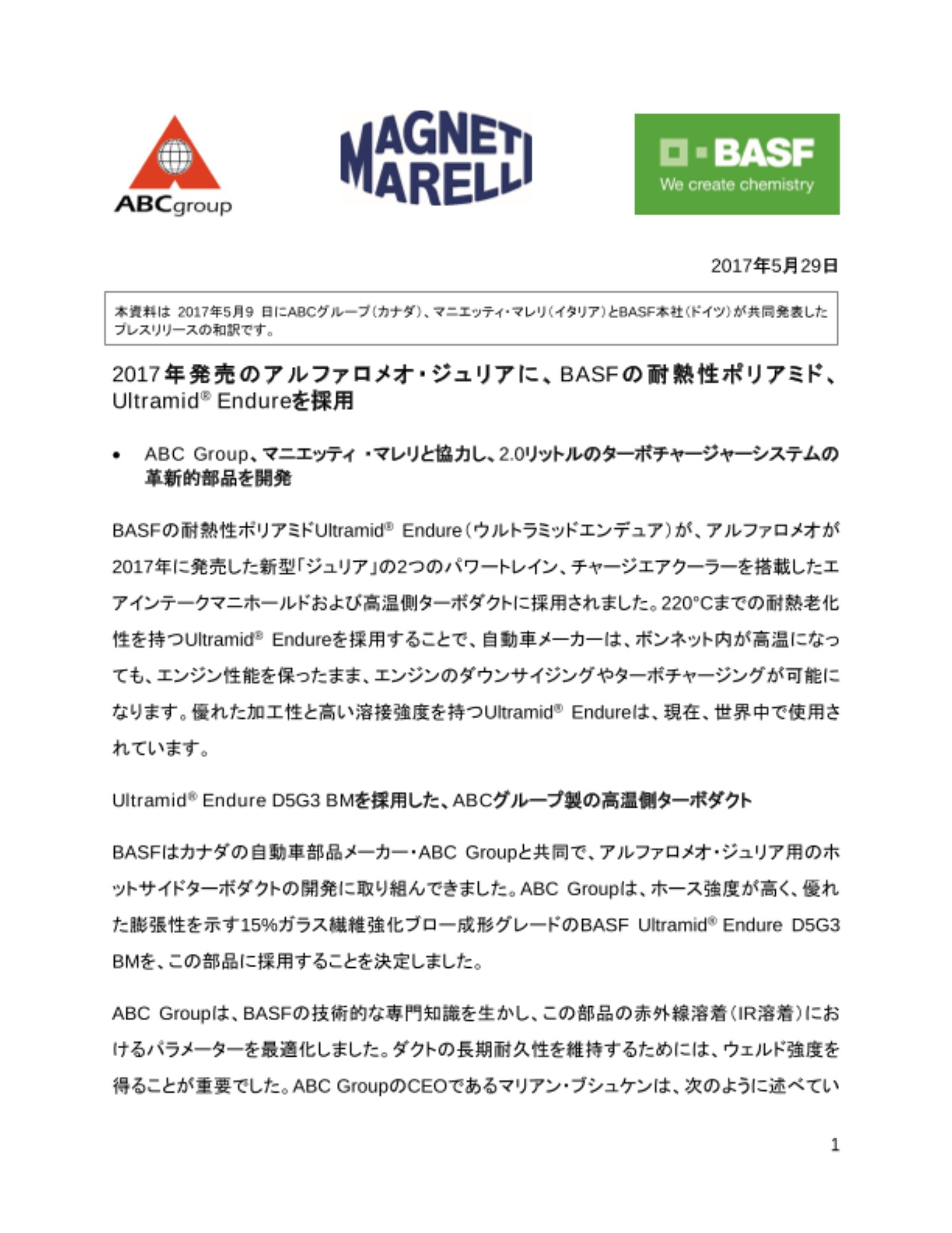 (本資料は 2017年5月9 日にABCグループ(カナダ)、マニエッティ・マレリ(イタリア)とBASF本社(ドイツ)が共同発表したプレスリリースの和訳です。)