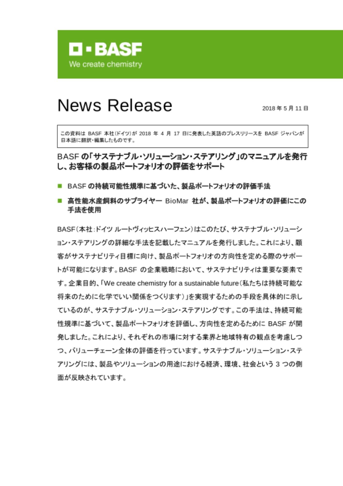 (この資料はBASF本社(ドイツ)が 2018年4月17日に発表した英語のプレスリリースをBASFジャパンが日本語に翻訳・編集したものです。)