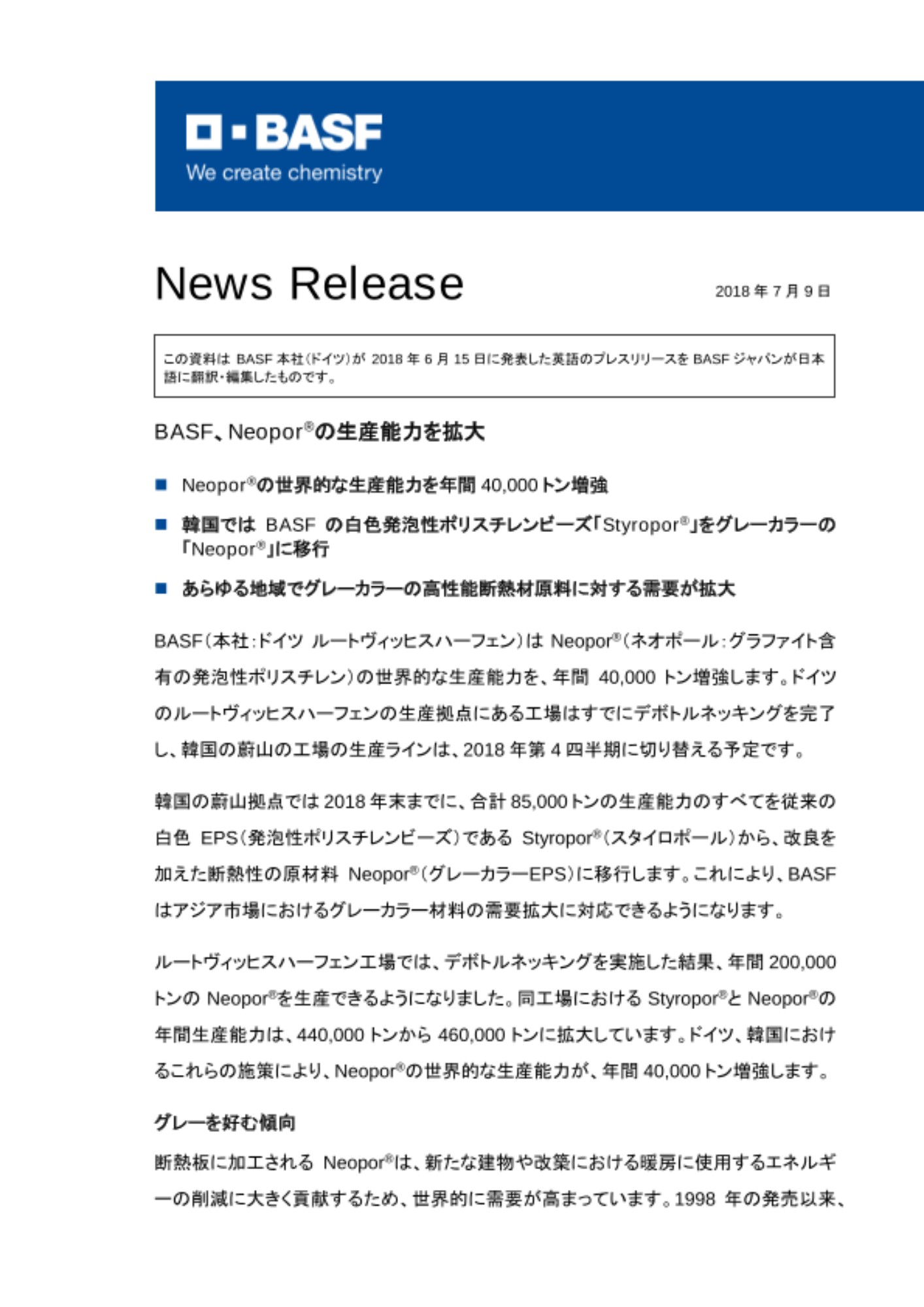 BASF(本社:ドイツ ルートヴィッヒスハーフェン)はNeopor®(ネオポール:グラファイト含有の発泡性ポリスチレン)の世界的な生産能力を、年間40,000トン増強します。ドイツのルートヴィッヒスハーフェンの生産拠点にある工場はすでにデボトルネッキングを完了し、韓国の蔚山の工場の生産ラインは、2018年第4四半期に切り替える予定です。