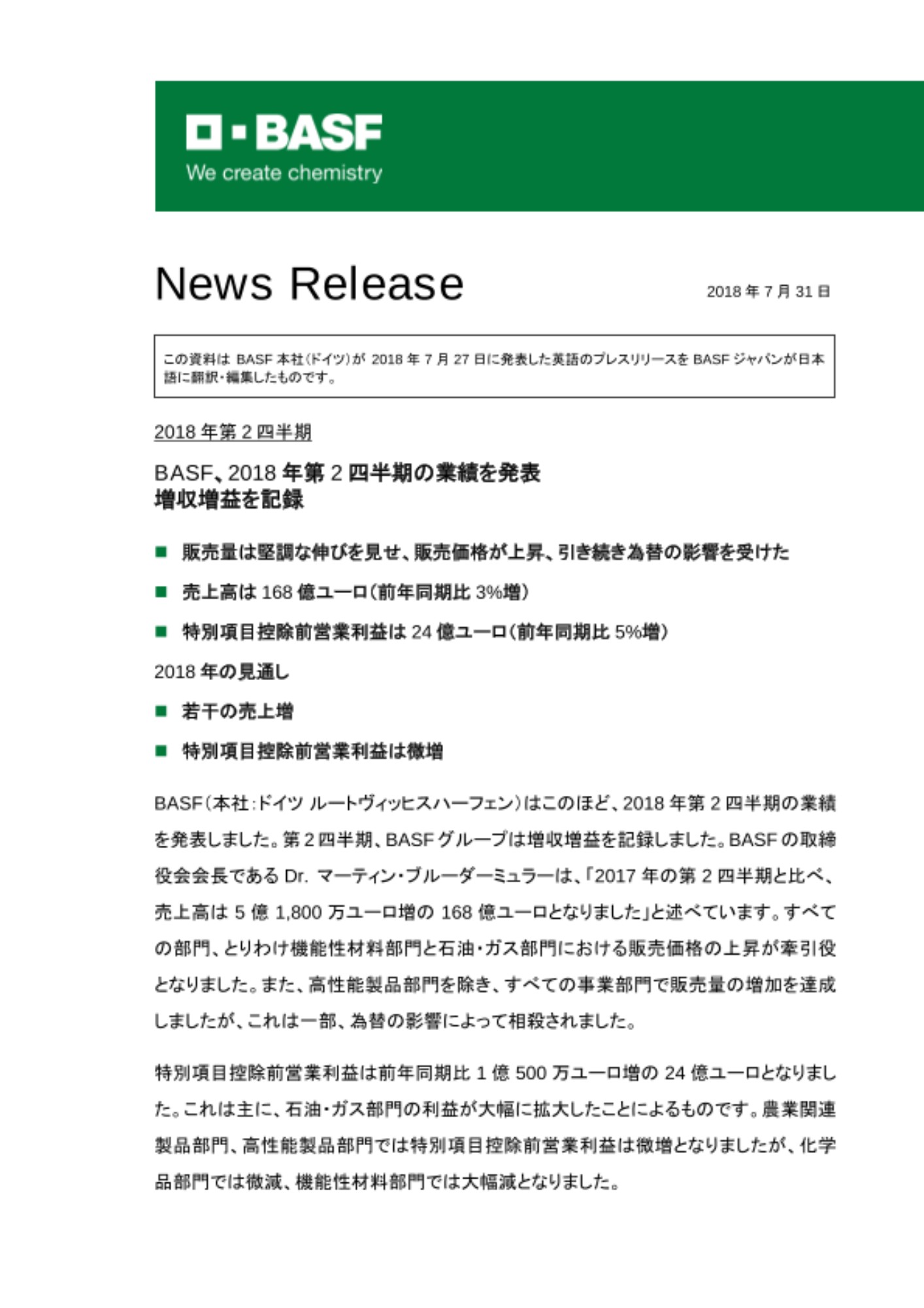 (この資料は BASF本社(ドイツ)が 2018年7月27日に発表した英語のプレスリリースをBASFジャパンが日本語に翻訳・編集したものです。)