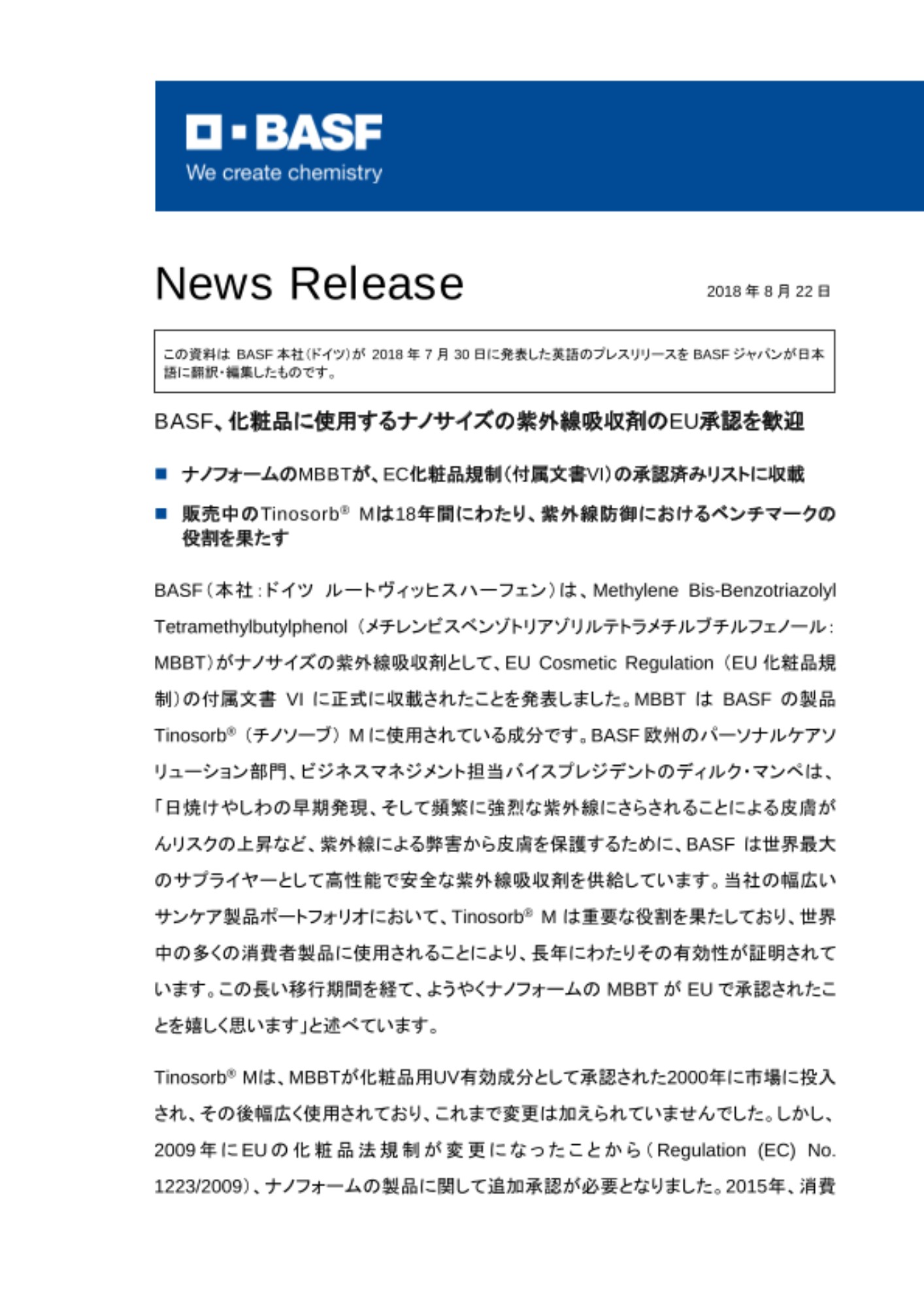 BASF(本社:ドイツ ルートヴィッヒスハーフェン)は、Methylene Bis-Benzotriazolyl Tetramethylbutylphenol (メチレンビスベンゾトリアゾリルテトラメチルブチルフェノール:MBBT)がナノサイズの紫外線吸収剤として、EU Cosmetic Regulation (EU化粧品規制)の付属文書VIに正式に収載されたことを発表しました。MBBTはBASFの製品Tinosorb® (チノソーブ) Mに使用されている成分です。BASF欧州のパーソナルケアソリューション部門、ビジネスマネジメント担当バイスプレジデントのディルク・マンペは、「日焼けやしわの早期発現、そして頻繁に強烈な紫外線にさらされることによる皮膚がんリスクの上昇など、紫外線による弊害から皮膚を保護するために、BASFは世界最大のサプライヤーとして高性能で安全な紫外線吸収剤を供給しています。当社の幅広いサンケア製品ポートフォリオにおいて、Tinosorb® Mは重要な役割を果たしており、世界中の多くの消費者製品に使用されることにより、長年にわたりその有効性が証明されています。この長い移行期間を経て、ようやくナノフォームのMBBTがEUで承認されたことを嬉しく思います」と述べています。