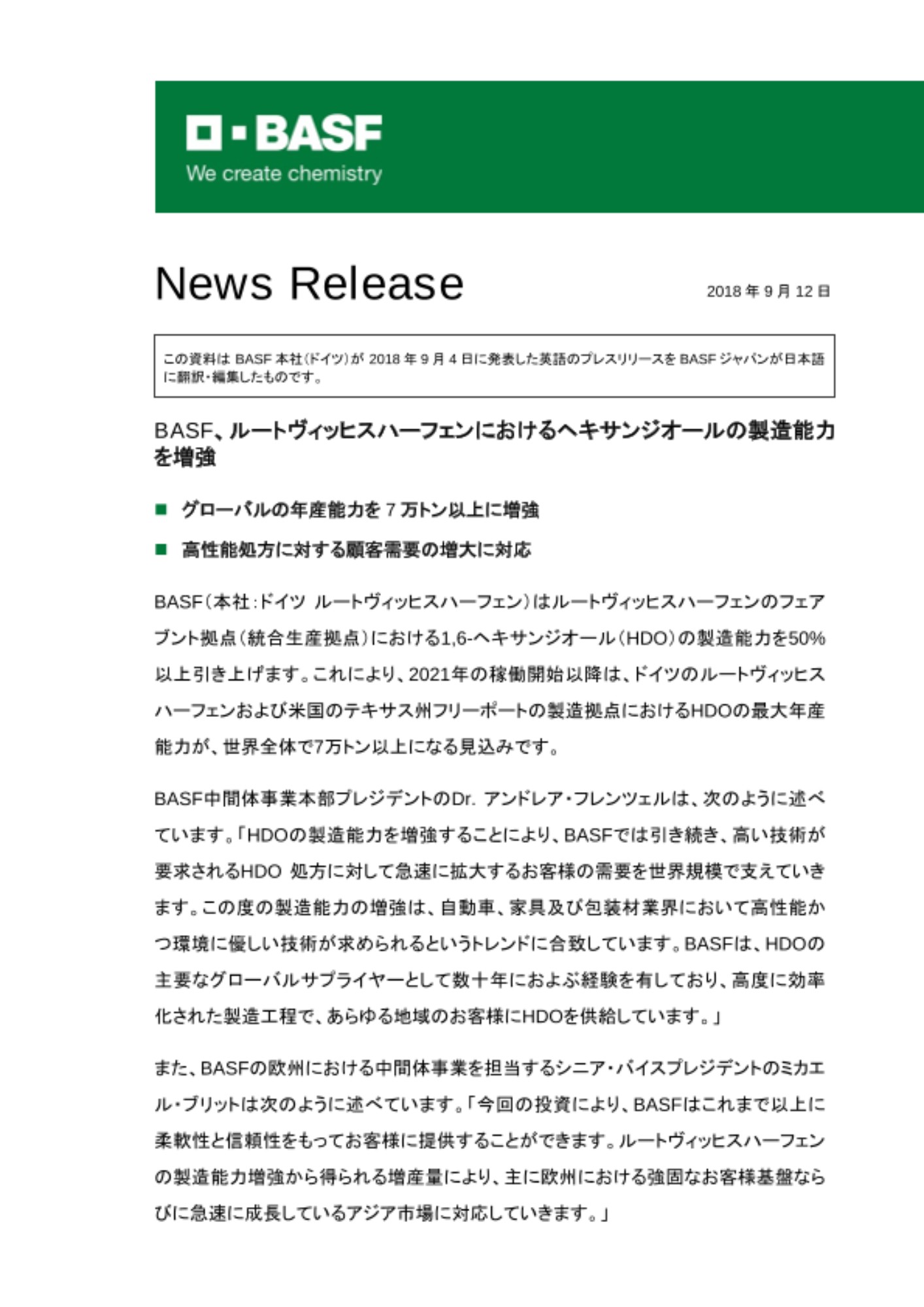 (この資料は BASF本社(ドイツ)が 2018年9月4日に発表した英語のプレスリリースをBASFジャパンが日本語に翻訳・編集したものです。)