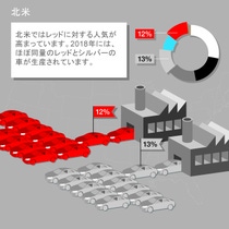 2018年も、無彩色は依然として北米で最も人気のある自動車用カラーであり、北米における生産の約75%を占めました。無彩色の中では、ホワイトが主導的なポジションを保っています。無彩色以外では、消費者は、特にピックアップおよびスポーツカーにおいて、レッドに対する親近感の高まりを示しました。多様なブルーのカラースペースは、前年とほぼ同じでした。
