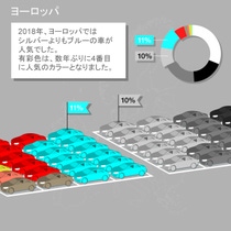 ヨーロッパではほぼ5台に1台がグレーです。ブラックに取って代わった2番目に人気のある色です。購入者は、明るいグレーから暗いメタリックのアントラシット(消炭色)まで110種類以上の中から選ぶことができます。ブルーはさらに多くの選択肢があります。約140もの色数が、ブルーをこの地域で最も多様な色域にしています。2018年には、シルバーを抜き、11%のシェアを持つヨーロッパで4番目に好まれる色となりました。