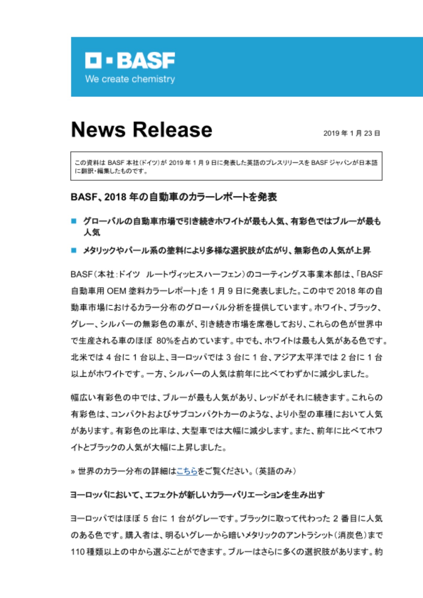 BASF(本社:ドイツ ルートヴィッヒスハーフェン)のコーティングス事業本部は、「BASF自動車用OEM塗料カラーレポート」を1月9日に発表しました。この中で2018年の自動車市場におけるカラー分布のグローバル分析を提供しています。ホワイト、ブラック、グレー、シルバーの無彩色の車が、引き続き市場を席巻しており、これらの色が世界中で生産される車のほぼ80%を占めています。中でも、ホワイトは最も人気がある色です。北米では4台に1台以上、ヨーロッパでは3台に1台、アジア太平洋では2台に1台以上がホワイトです。一方、シルバーの人気は前年に比べてわずかに減少しました。