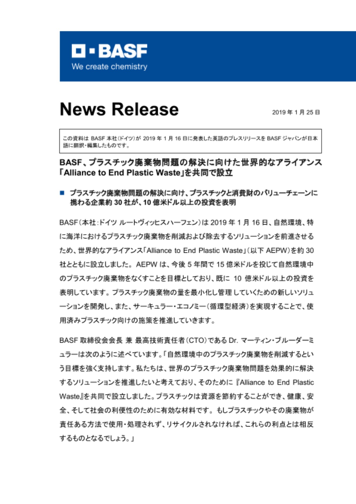 BASF(本社:ドイツ ルートヴィッヒスハーフェン)は2019年1月16日、自然環境、特に海洋におけるプラスチック廃棄物を削減および除去するソリューションを前進させるため、世界的なアライアンス「Alliance to End Plastic Waste」(以下AEPW)を約30社とともに設立しました。AEPWは、今後5年間で15億米ドルを投じて自然環境中のプラスチック廃棄物をなくすことを目標としており、既に10億米ドル以上の投資を表明しています。プラスチック廃棄物の量を最小化し管理 していくための新しいソリューションを開発し、また、サーキュラー・エコノミー(循環型経済)を実現することで、使用済みプラスチック向けの施策を推進していきます。
