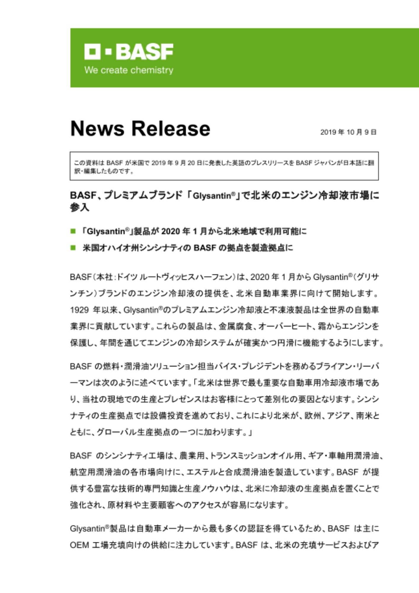 BASF(本社:ドイツ ルートヴィッヒスハーフェン)は、2020年1月からGlysantin®(グリサンチン)ブランドのエンジン冷却液の提供を、北米自動車業界に向けて開始します。1929年以来、Glysantin®のプレミアムエンジン冷却液と不凍液製品は全世界の自動車業界に貢献しています。これらの製品は、金属腐食、オーバーヒート、霜からエンジンを保護し、年間を通じてエンジンの冷却システムが確実かつ円滑に機能するようにします。
