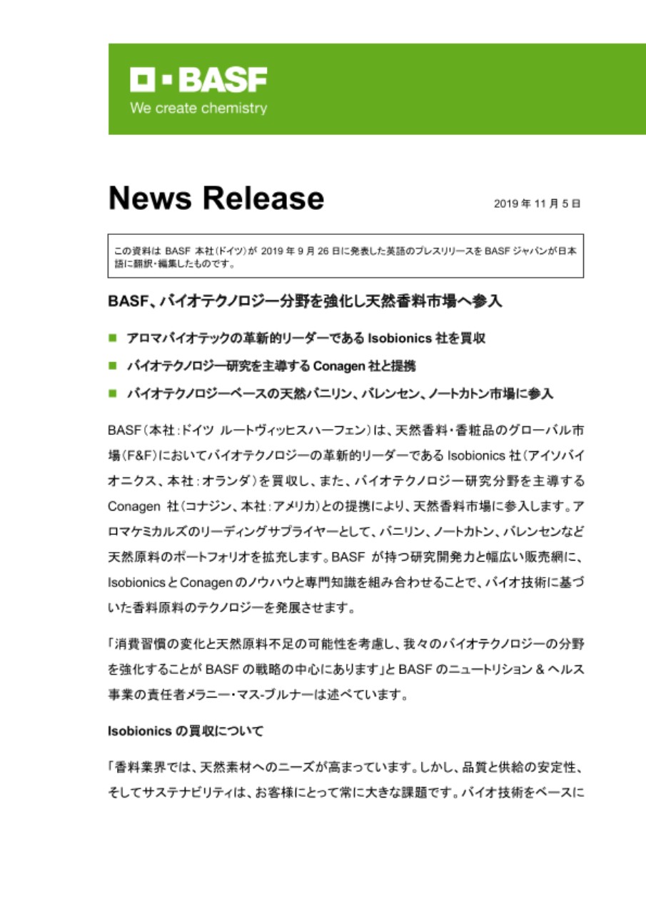 BASF(本社:ドイツ ルートヴィッヒスハーフェン)は、天然香料・香粧品のグローバル市場(F&F)においてバイオテクノロジーの革新的リーダーであるIsobionics社(アイソバイオニクス、本社:オランダ)を買収し、また、バイオテクノロジー研究分野を主導するConagen社(コナジン、本社:アメリカ)との提携により、天然香料市場に参入します。アロマケミカルズのリーディングサプライヤーとして、バニリン、ノートカトン、バレンセンなど天然原料のポートフォリオを拡充します。BASFが持つ研究開発力と幅広い販売網に、IsobionicsとConagenのノウハウと専門知識を組み合わせることで、バイオ技術に基づいた香料原料のテクノロジーを発展させます。