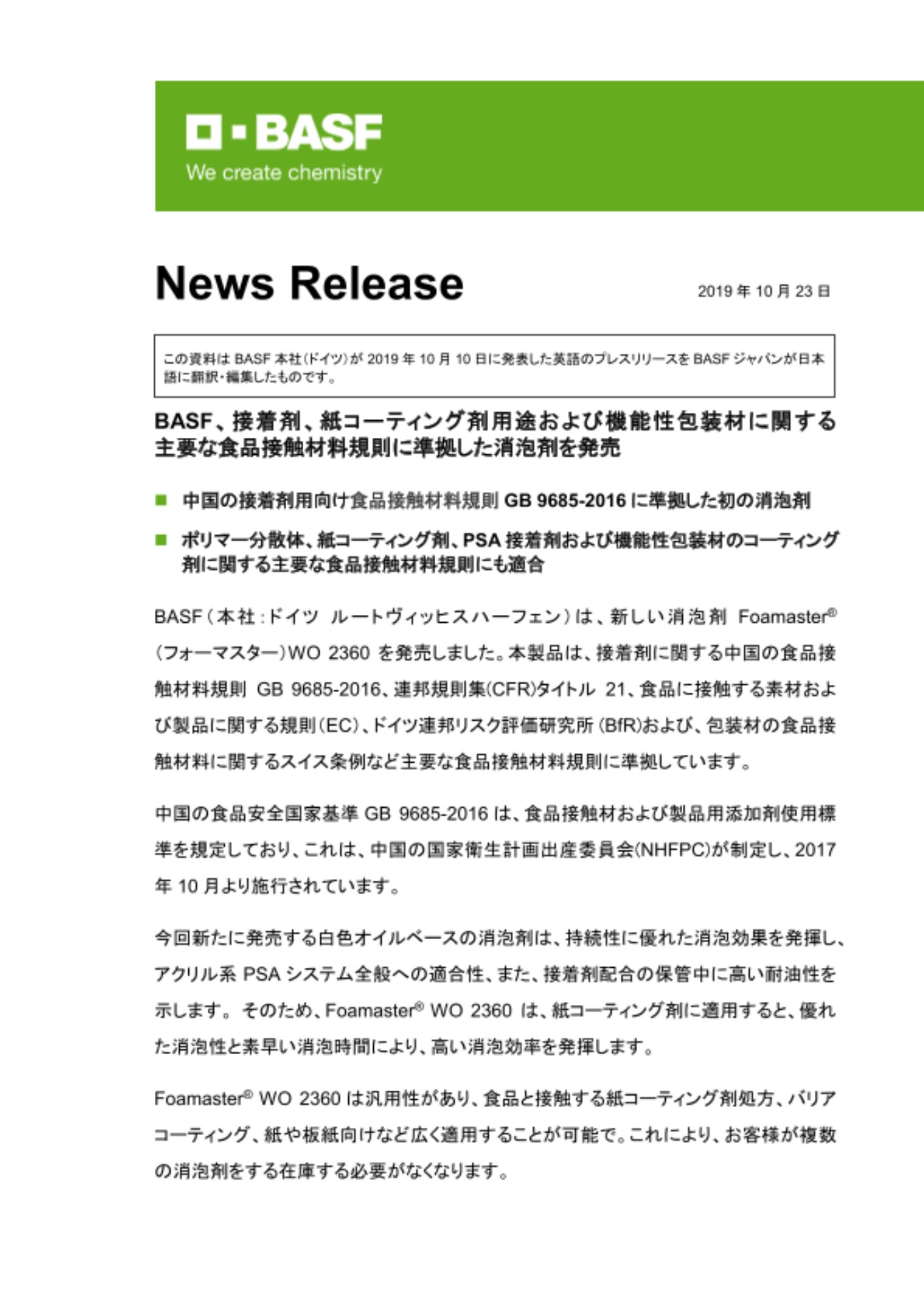 BASF(本社:ドイツ ルートヴィッヒスハーフェン)は、新しい消泡剤Foamaster®(フォーマスター)WO 2360を発売しました。本製品は、接着剤に関する中国の食品接触材料規則GB 9685-2016、連邦規則集(CFR)タイトル21、食品に接触する素材および製品に関する規則(EC)、ドイツ連邦リスク評価研究所(BfR)および、包装材の食品接触材料に関するスイス条例など主要な食品接触材料規則に準拠しています。