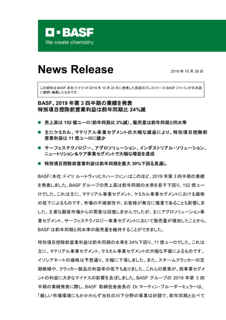 BASF、2019年第3四半期の業績を発表、特別項目控除前営業利益は前年同期比24%減