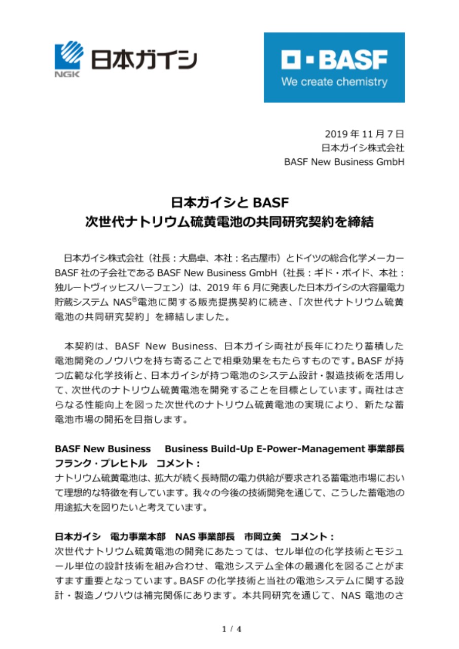 日本ガイシ株式会社(社長:大島卓、本社:名古屋市)とドイツの総合化学メーカーBASF社の子会社であるBASF New Business GmbH(社長:ギド・ボイド、本社:独ルートヴィッヒスハーフェン)は、2019年6月に発表した日本ガイシの大容量電力貯蔵システムNAS®電池に関する販売提携契約に続き、「次世代ナトリウム硫黄電池の共同研究契約」を締結しました。