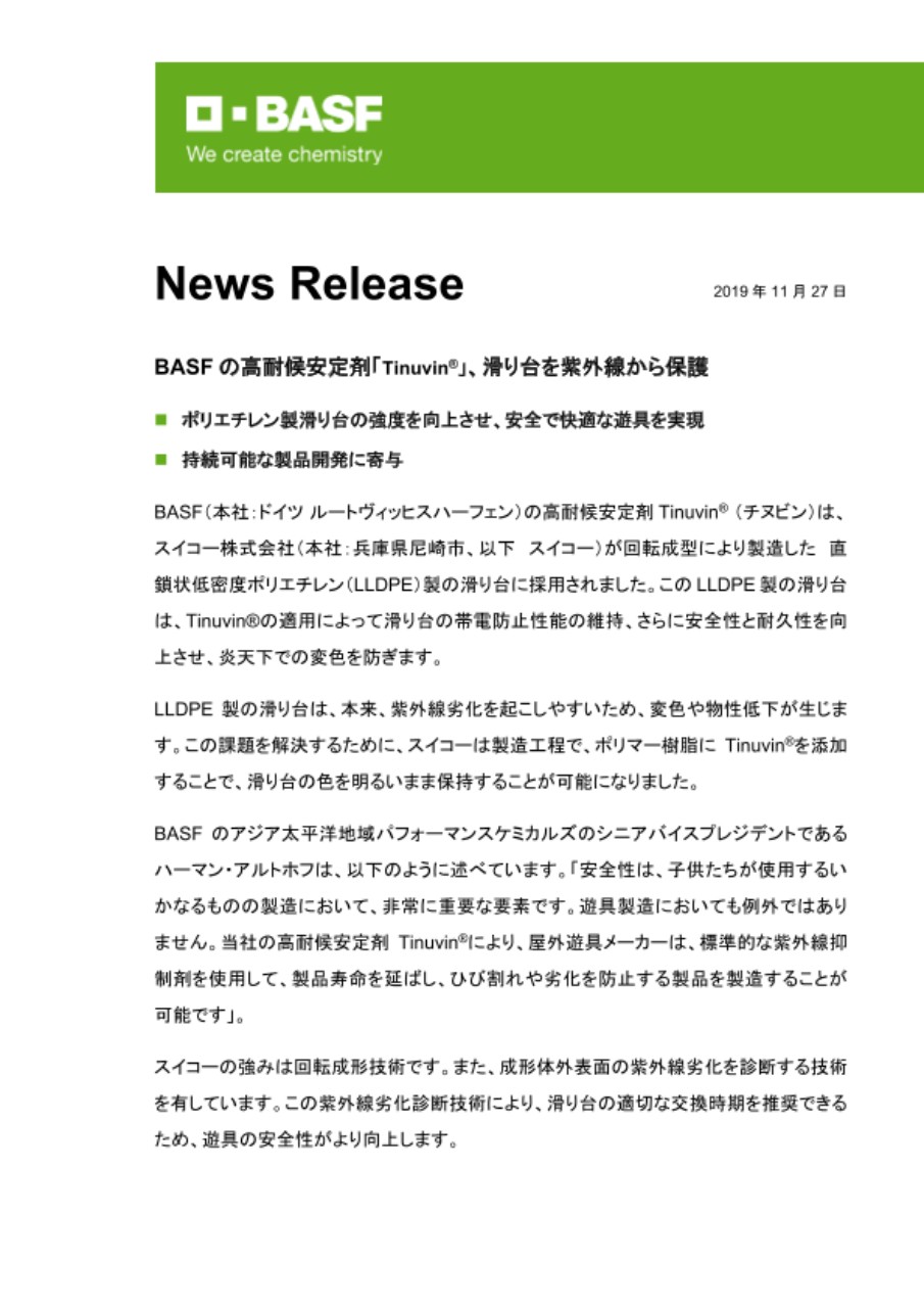 スイコーの坂木博之・研究開発室長は、「滑り台は通常屋外に設置され、厳しい気象条件に耐える必要があります。私たちは、そのような過酷な状況において、ポリエチレンの物性だけでなく、帯電防止性能を維持することが課題でした。BASFは、豊富な紫外線吸収剤や光安定剤、包括的な耐候性試験データに基づき、適確な製品選定、添加量の提案を行い、このニーズに応えてくれました」と述べています。