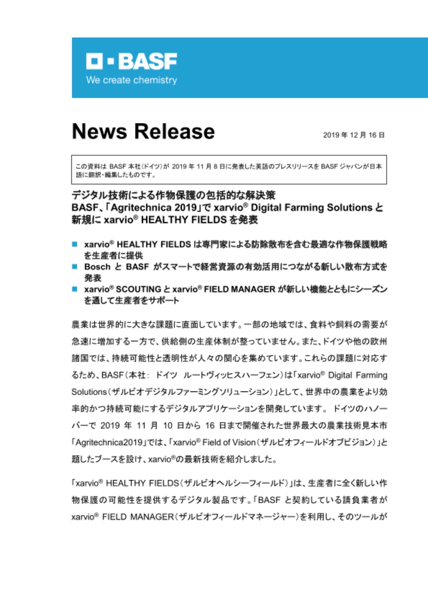 デジタル技術による作物保護の包括的な解決策-BASF、「Agritechnica 2019」でxarvio® Digital Farming Solutionsと新規にxarvio® HEALTHY FIELDSを発表