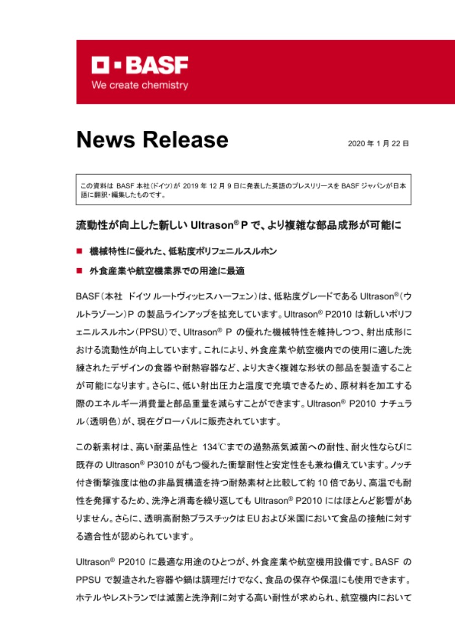 BASF(本社 ドイツ ルートヴィッヒスハーフェン)は、低粘度グレードであるUltrason®(ウルトラゾーン)Pの製品ラインアップを拡充しています。Ultrason® P2010は新しいポリフェニルスルホン(PPSU)で、Ultrason® Pの優れた機械特性を維持しつつ、射出成形における流動性が向上しています。これにより、外食産業や航空機内での使用に適した洗練されたデザインの食器や耐熱容器など、より大きく複雑な形状の部品を製造することが可能になります。さらに、低い射出圧力と温度で充填できるため、原材料を加工する際のエネルギー消費量と部品重量を減らすことができます。Ultrason® P2010ナチュラル(透明色)が、現在グローバルに販売されています。