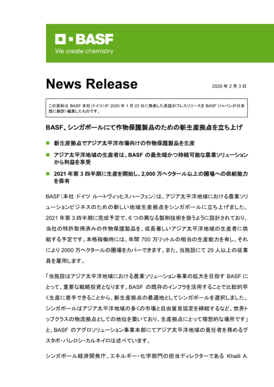 シンガポール経済開発庁、エネルギー・化学部門の担当ディレクターであるKhalil A. Bakar氏は次のように述べました。「将来に向けた食料の確保は世界的な課題です。 BASFがシンガポールに新しい地域生産拠点の設立を決定したことを、大変嬉しく思っています。これにより、安全で栄養価が高く、手頃な価格の食品の供給が強化されます。またアジア市場に隣接していることで、BASFは成長を遂げつつある農業技術分野で新たな機会を獲得することができます。」