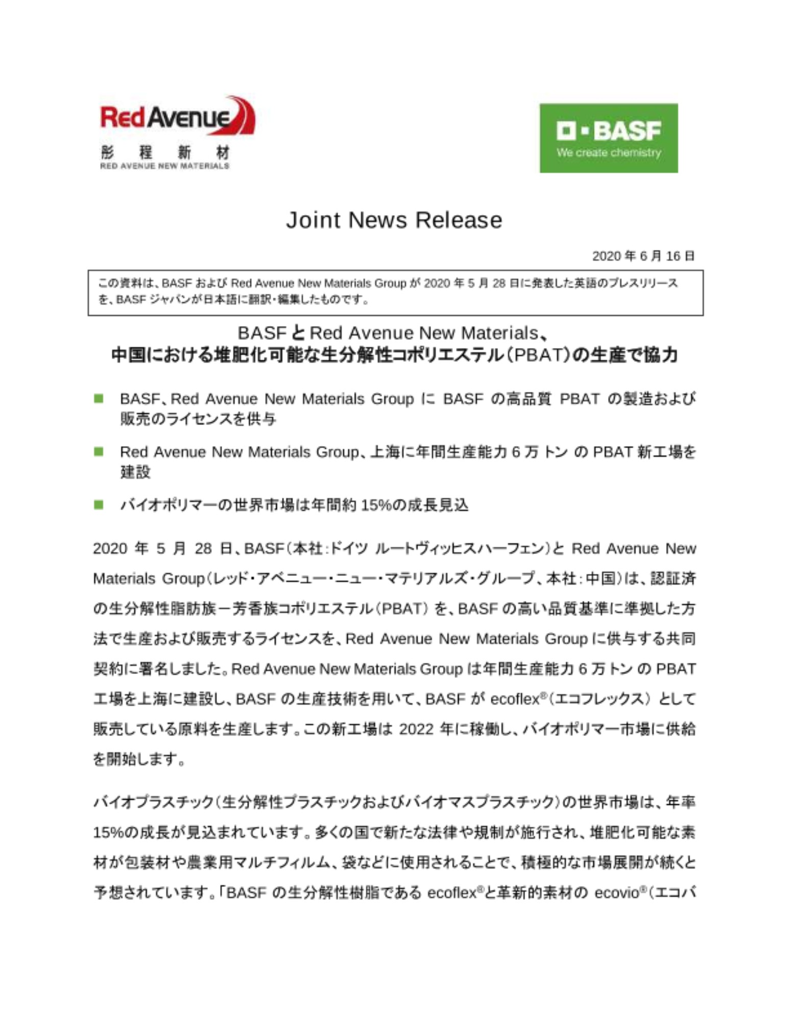 2020年5月28日、BASF(本社:ドイツルートヴィッヒスハーフェン)とRed Avenue New Materials Group(レッド・アベニュー・ニュー・マテリアルズ・グループ、本社:中国)は、認証済の生分解性脂肪族-芳香族コポリエステル(PBAT) を、BASFの高い品質基準に準拠した方法で生産および販売するライセンスを、Red Avenue New Materials Groupに供与する共同契約に署名しました。Red Avenue New Materials Groupは年間生産能力6万トンのPBAT工場を上海に建設し、BASFの生産技術を用いて、BASFがecoflex®(エコフレックス) として販売している原料を生産します。この新工場は2022年に稼働し、バイオポリマー市場に供給を開始します。