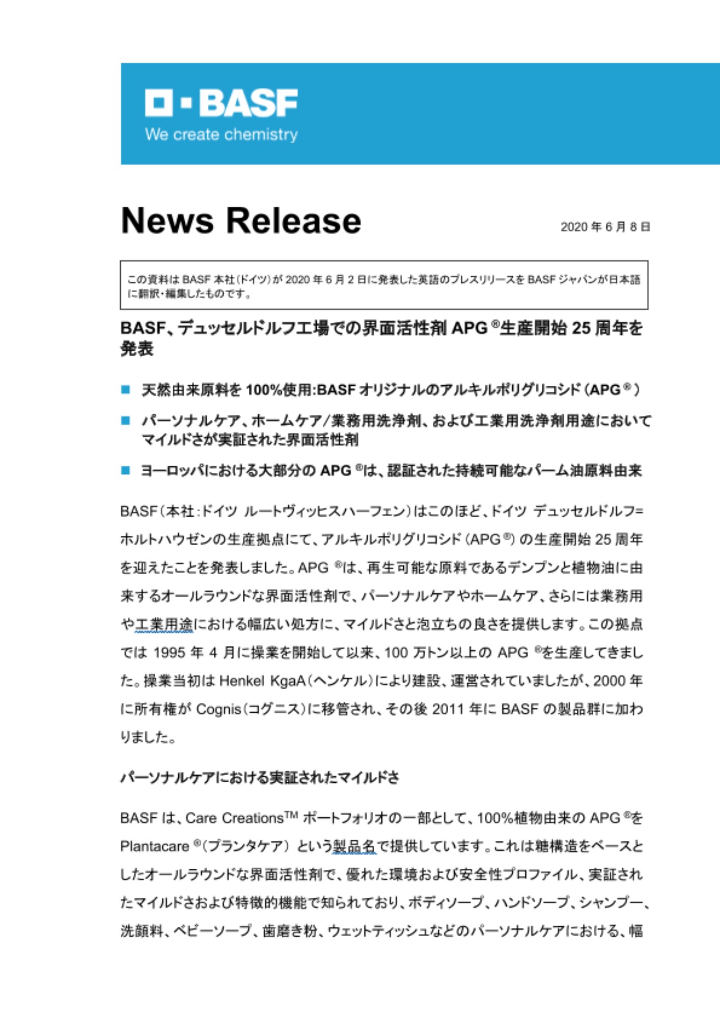 BASF(本社:ドイツ ルートヴィッヒスハーフェン)はこのほど、ドイツ デュッセルドルフ=ホルトハウゼンの生産拠点にて、アルキルポリグリコシド (APG ®) の生産開始25周年を迎えたことを発表しました。APG ®は、再生可能な原料であるデンプンと植物油に由来するオールラウンドな界面活性剤で、パーソナルケアやホームケア、さらには業務用や工業用途における幅広い処方に、マイルドさと泡立ちの良さを提供します。この拠点では1995年4月に操業を開始して以来、100万トン以上のAPG ®を生産してきました。操業当初はHenkel KgaA(ヘンケル)により建設、運営されていましたが、2000年に所有権がCognis(コグニス)に移管され、その後2011年にBASFの製品群に加わりました。