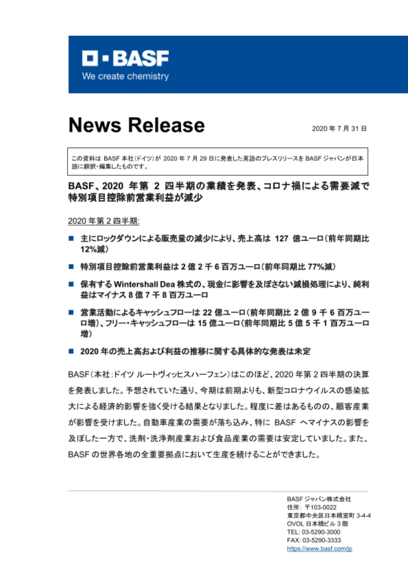 この資料は BASF本社(ドイツ)が 2020年7月29日に発表した英語のプレスリリースをBASFジャパンが日本語に翻訳・編集したものです。
