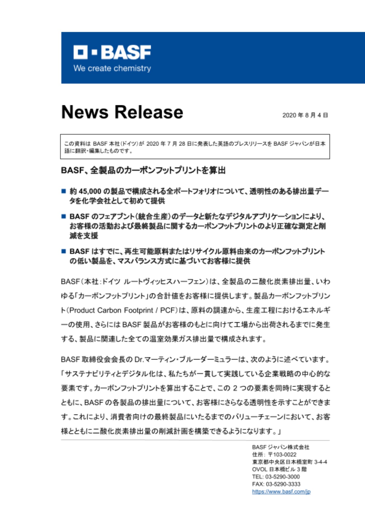 この資料は BASF本社(ドイツ)が 2020年7月28日に発表した英語のプレスリリースをBASFジャパンが日本語に翻訳・編集したものです。