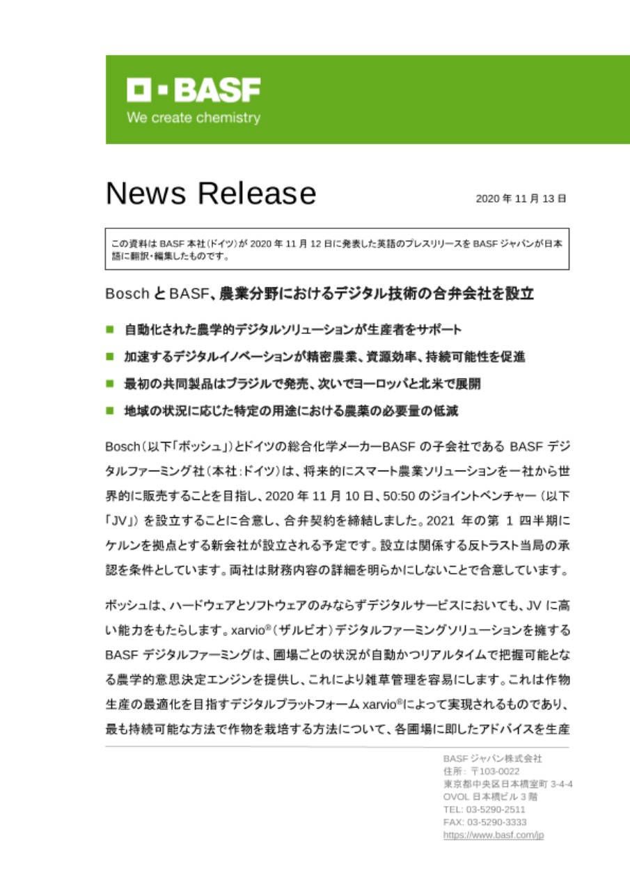 Bosch(以下「ボッシュ」)とドイツの総合化学メーカーBASFの子会社である BASFデジタルファーミング社(本社:ドイツ)は、将来的にスマート農業ソリューションを一社から世界的に販売することを目指し、2020年11月10日、50:50のジョイントベンチャー (以下「JV」) を設立することに合意し、合弁契約を締結しました。2021年の第1四半期にケルンを拠点とする新会社が設立される予定です。設立は関係する反トラスト当局の承認を条件としています。両社は財務内容の詳細を明らかにしないことで合意しています。