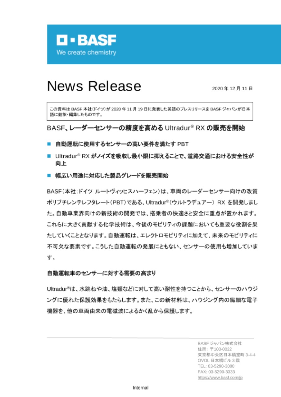 BASFパフォーマンスマテリアルズ事業本部のUltradur®研究開発部門のエリック・ガベルズは、次のように述べています。「新たなUltradur® RXシリーズのグレードはどれも76〜81ギガヘルツ(GHz)の干渉電波を吸収し、最小限に抑えるよう設計された製品であるため、繊細な電子機器を高いレベルで保護します。このように誘電特性を最適化した材料は、センサー部品に求められる高い基準を満たすとともに、レーダーセンサーのハウジングカバーやセンサーのプリント基板背面材といった用途に最適です。」