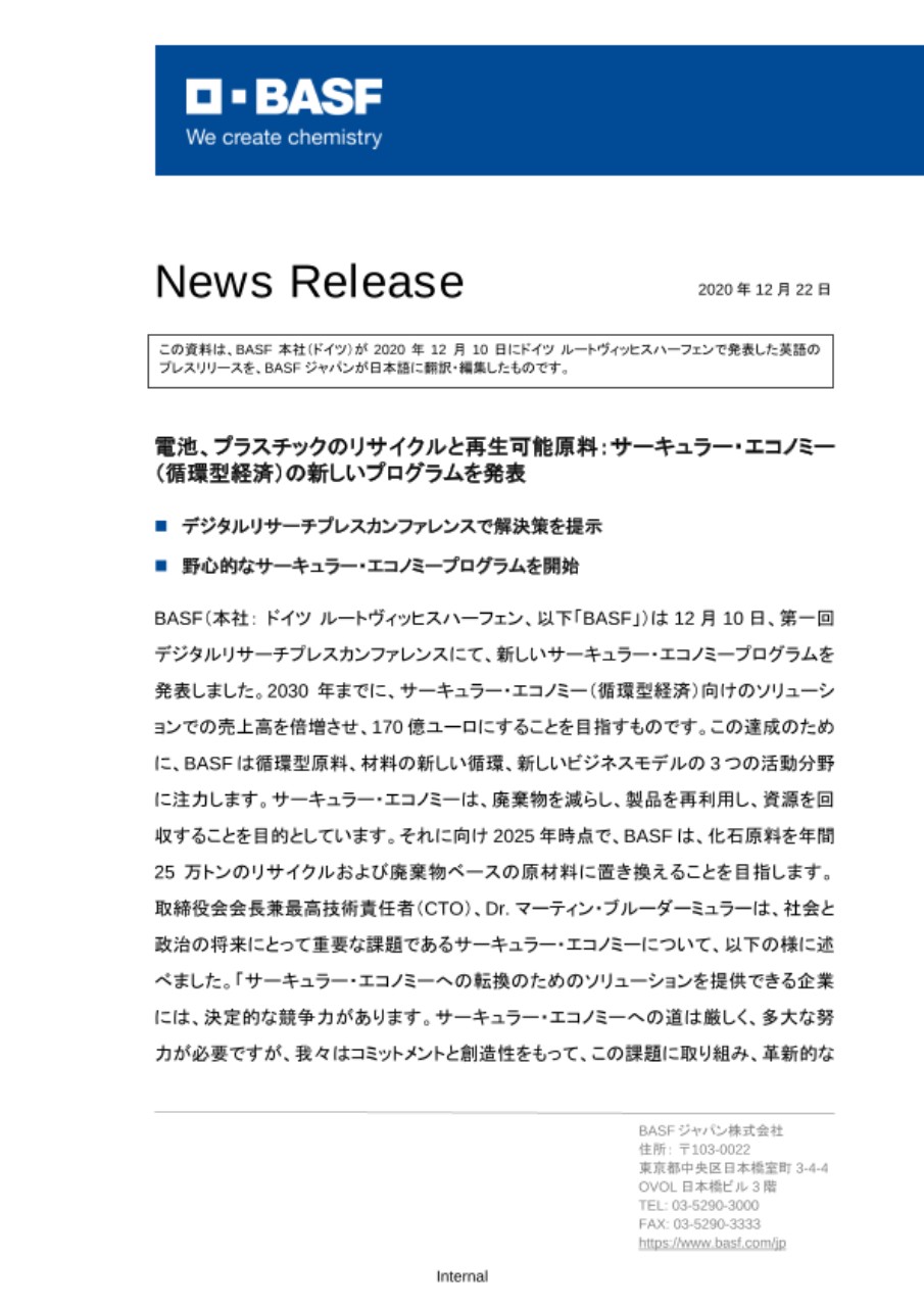 BASF(本社: ドイツ ルートヴィッヒスハーフェン、以下「BASF」)は12月10日、第一回デジタルリサーチプレスカンファレンスにて、新しいサーキュラー・エコノミープログラムを発表しました。2030年までに、サーキュラー・エコノミー(循環型経済)向けのソリューションでの売上高を倍増させ、170億ユーロにすることを目指すものです。この達成のために、BASFは循環型原料、材料の新しい循環、新しいビジネスモデルの3つの活動分野に注力します。サーキュラー・エコノミーは、廃棄物を減らし、製品を再利用し、資源を回収することを目的としています。それに向け2025年時点で、BASFは、化石原料を年間25万トンのリサイクルおよび廃棄物ベースの原材料に置き換えることを目指します。
