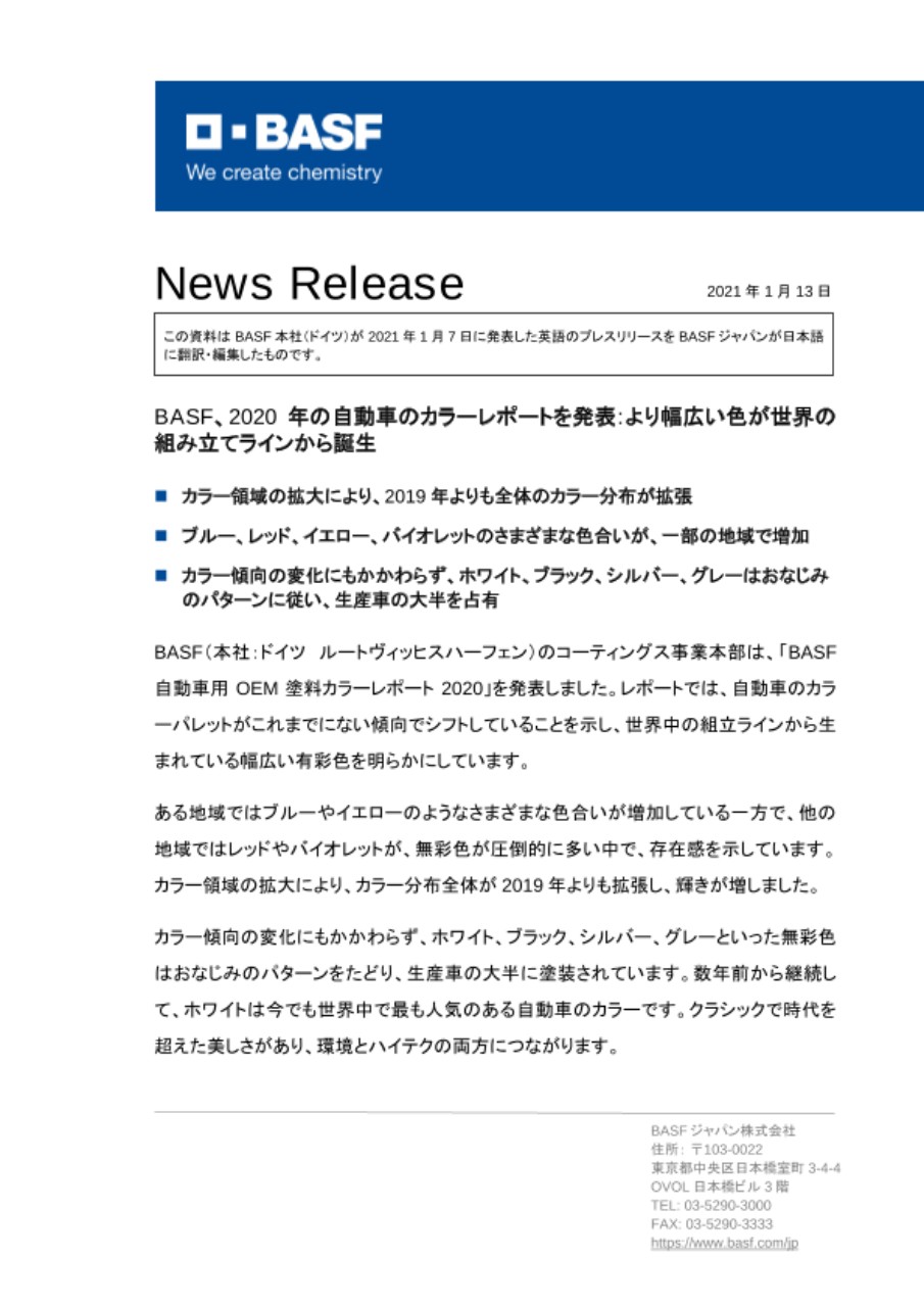 日本の状況を含む「BASF自動車用OEM塗料カラーレポート2020」についてはhttps://www.basf.com/jp/documents/ja/news-and-media/news-releases/2021/BASF_Color_Report_2020_Press_Kit_JP.pdfをご覧ください。