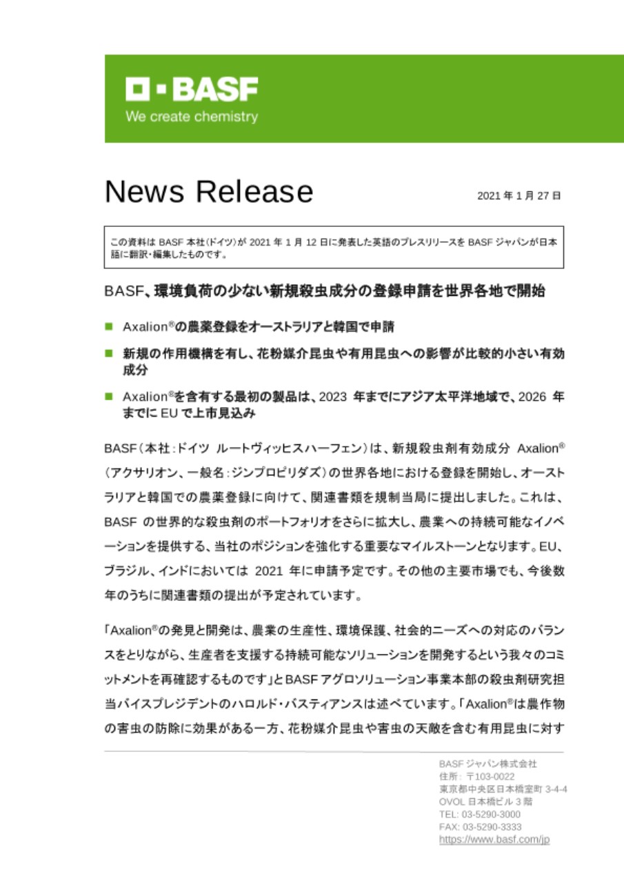 BASF(本社:ドイツ ルートヴィッヒスハーフェン)は、新規殺虫剤有効成分Axalion®(アクサリオン、一般名:ジンプロピリダズ)の世界各地における登録を開始し、オーストラリアと韓国での農薬登録に向けて、関連書類を規制当局に提出しました。これは、BASFの世界的な殺虫剤のポートフォリオをさらに拡大し、農業への持続可能なイノベーションを提供する、当社のポジションを強化する重要なマイルストーンとなります。EU、ブラジル、インドにおいては2021年に申請予定です。その他の主要市場でも、今後数年のうちに関連書類の提出が予定されています。