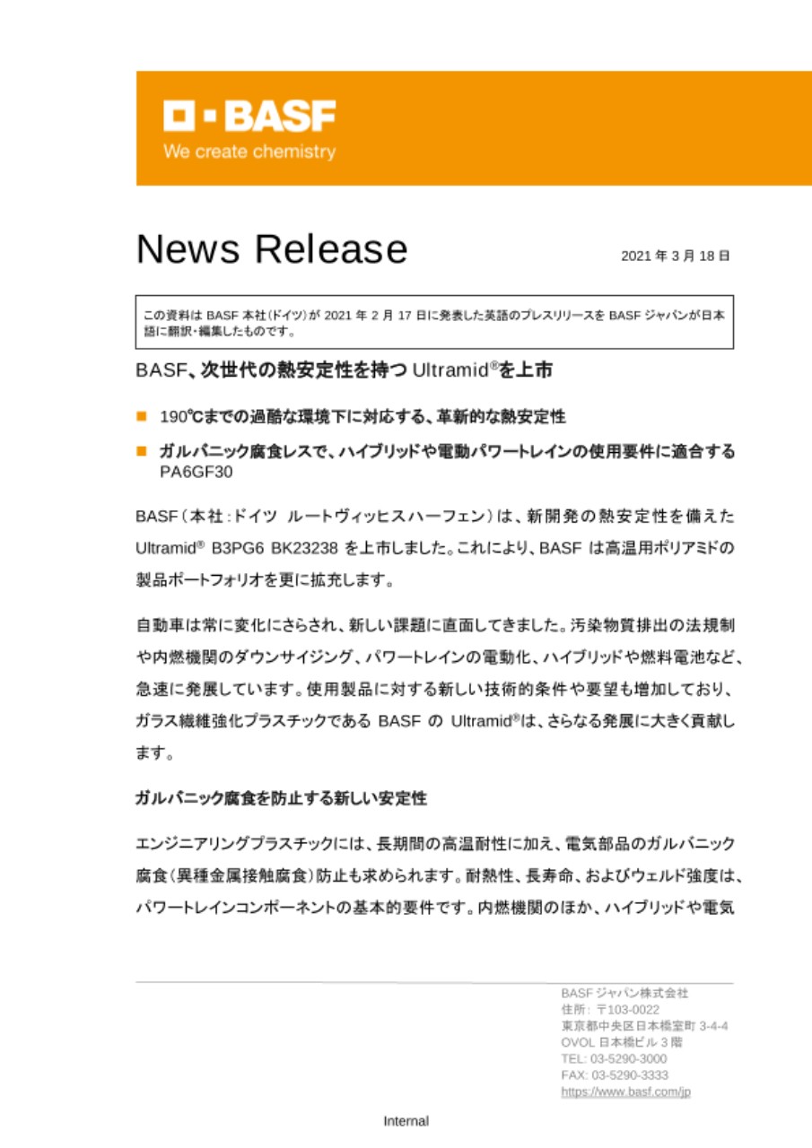 BASF(本社:ドイツ ルートヴィッヒスハーフェン)は、新開発の熱安定性を備えたUltramid® B3PG6 BK23238を上市しました。これにより、BASFは高温用ポリアミドの製品ポートフォリオを更に拡充します。