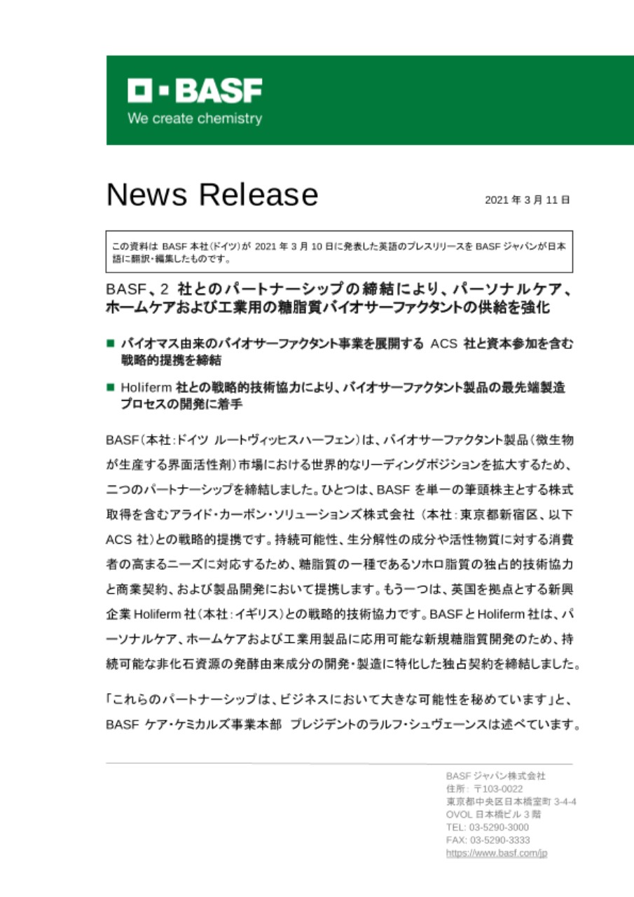 BASF(本社:ドイツ ルートヴィッヒスハーフェン)は、バイオサーファクタント製品(微生物が生産する界面活性剤)市場における世界的なリーディングポジションを拡大するため、二つのパートナーシップを締結しました。ひとつは、BASFを単一の筆頭株主とする株式取得を含むアライド・カーボン・ソリューションズ株式会社 (本社:東京都新宿区、以下ACS社)との戦略的提携です。持続可能性、生分解性の成分や活性物質に対する消費者の高まるニーズに対応するため、糖脂質の一種であるソホロ脂質の独占的技術協力と商業契約、および製品開発において提携します。もう一つは、英国を拠点とする新興企業Holiferm社(本社:イギリス)との戦略的技術協力です。BASFとHoliferm社は、パーソナルケア、ホームケアおよび工業用製品に応用可能な新規糖脂質開発のため、持続可能な非化石資源の発酵由来成分の開発・製造に特化した独占契約を締結しました。