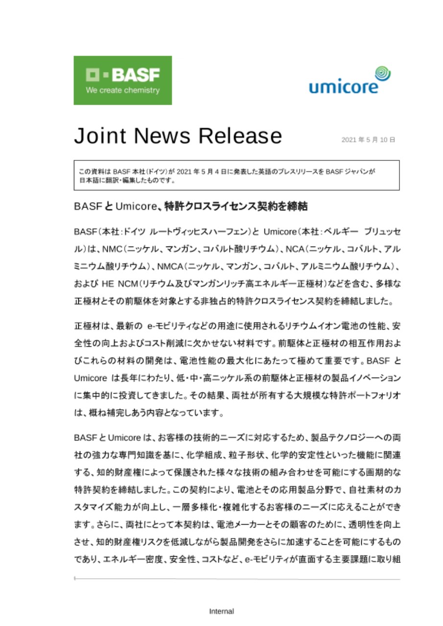 BASF(本社:ドイツ ルートヴィッヒスハーフェン)とUmicore(本社:ベルギー ブリュッセル)は、NMC(ニッケル、マンガン、コバルト酸リチウム)、NCA(ニッケル、コバルト、アルミニウム酸リチウム)、NMCA(ニッケル、マンガン、コバルト、アルミニウム酸リチウム)、およびHE NCM(リチウム及びマンガンリッチ高エネルギー正極材)などを含む、多様な正極材とその前駆体を対象とする非独占的特許クロスライセンス契約を締結しました。