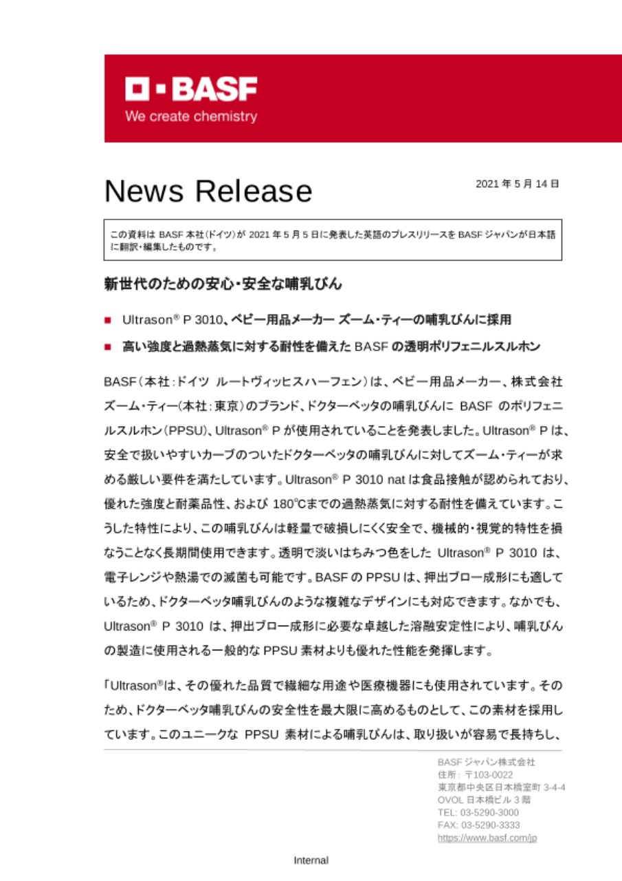 BASF(本社:ドイツ ルートヴィッヒスハーフェン)は、ベビー用品メーカー、株式会社ズーム・ティー(本社:東京)のブランド、ドクターベッタの哺乳びんにBASFのポリフェニルスルホン(PPSU)、Ultrason® Pが使用されていることを発表しました。Ultrason® Pは、安全で扱いやすいカーブのついたドクターベッタの哺乳びんに対してズーム・ティーが求める厳しい要件を満たしています。Ultrason® P 3010 natは食品接触が認められており、優れた強度と耐薬品性、および180℃までの過熱蒸気に対する耐性を備えています。こうした特性により、この哺乳びんは軽量で破損しにくく安全で、機械的・視覚的特性を損なうことなく長期間使用できます。透明で淡いはちみつ色をしたUltrason® P 3010は、電子レンジや熱湯での滅菌も可能です。BASFのPPSUは、押出ブロー成形にも適しているため、ドクターベッタ哺乳びんのような複雑なデザインにも対応できます。なかでも、Ultrason® P 3010は、押出ブロー成形に必要な卓越した溶融安定性により、哺乳びんの製造に使用される一般的なPPSU素材よりも優れた性能を発揮します。