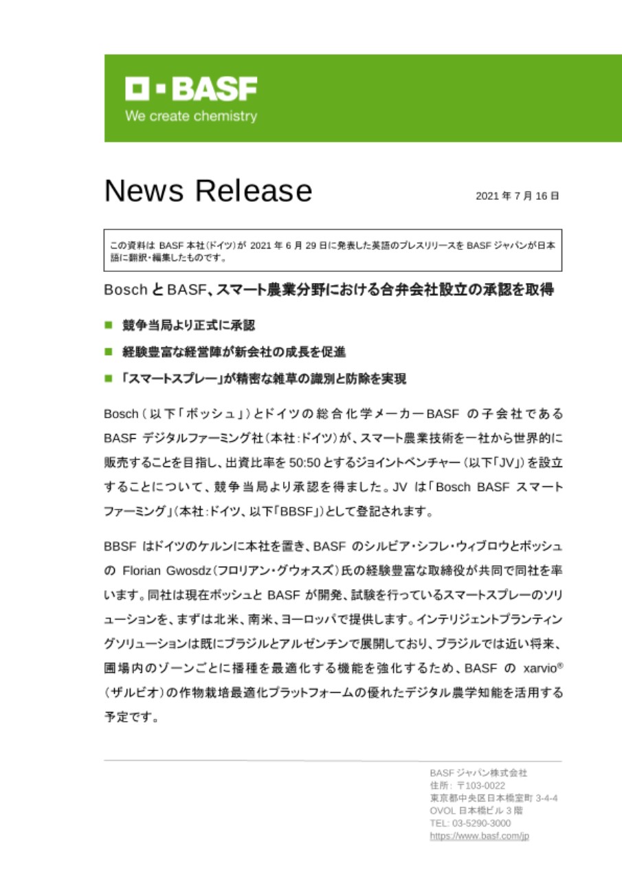 この資料は BASF本社(ドイツ)が 2021年6月29日に発表した英語のプレスリリースをBASFジャパンが日本語に翻訳・編集したものです。