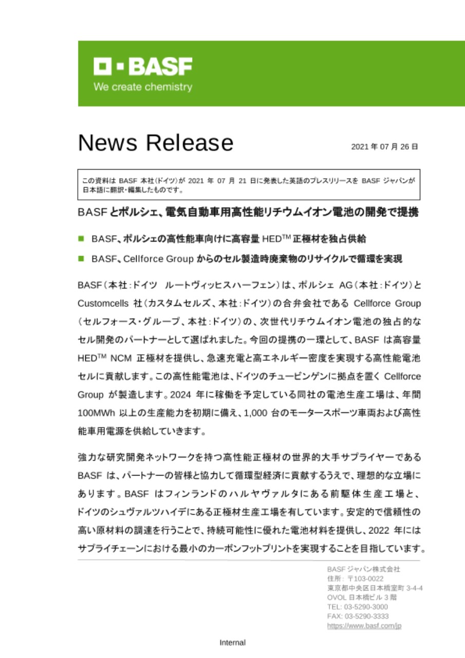 この資料は BASF本社(ドイツ)が 2021年07月21日に発表した英語のプレスリリースをBASFジャパンが日本語に翻訳・編集したものです。