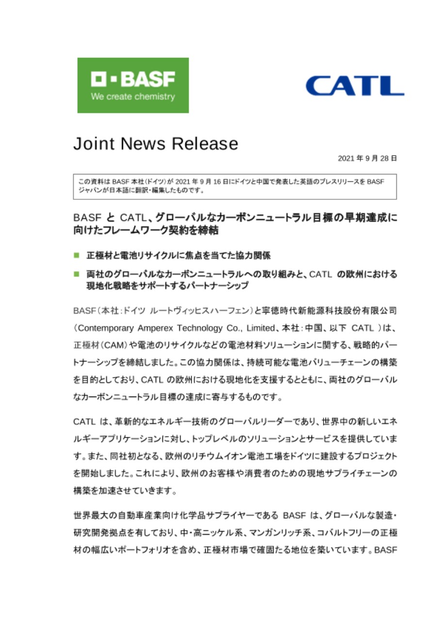 BASFとCATL、グローバルなカーボンニュートラル目標の早期達成に向けたフレームワーク契約を締結