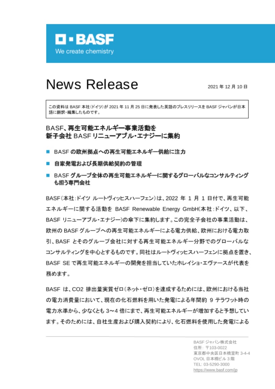 この資料は BASF本社(ドイツ)が 2021年11月25日に発表した英語のプレスリリースをBASFジャパンが日本語に翻訳・編集したものです。