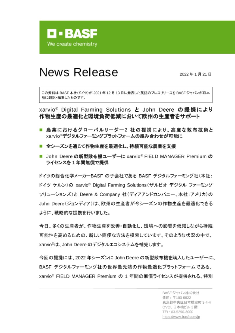ドイツの総合化学メーカーBASFの子会社であるBASFデジタルファーミング社(本社:ドイツ ケルン)のxarvio® Digital Farming Solutions(ザルビオ デジタル ファーミングソリューションズ)とDeere & Company社(ディアアンドカンパニー、本社:アメリカ)のJohn Deere(ジョンディア)は、欧州の生産者が今シーズンの作物生産を最適化できるように、戦略的な提携を行いました。