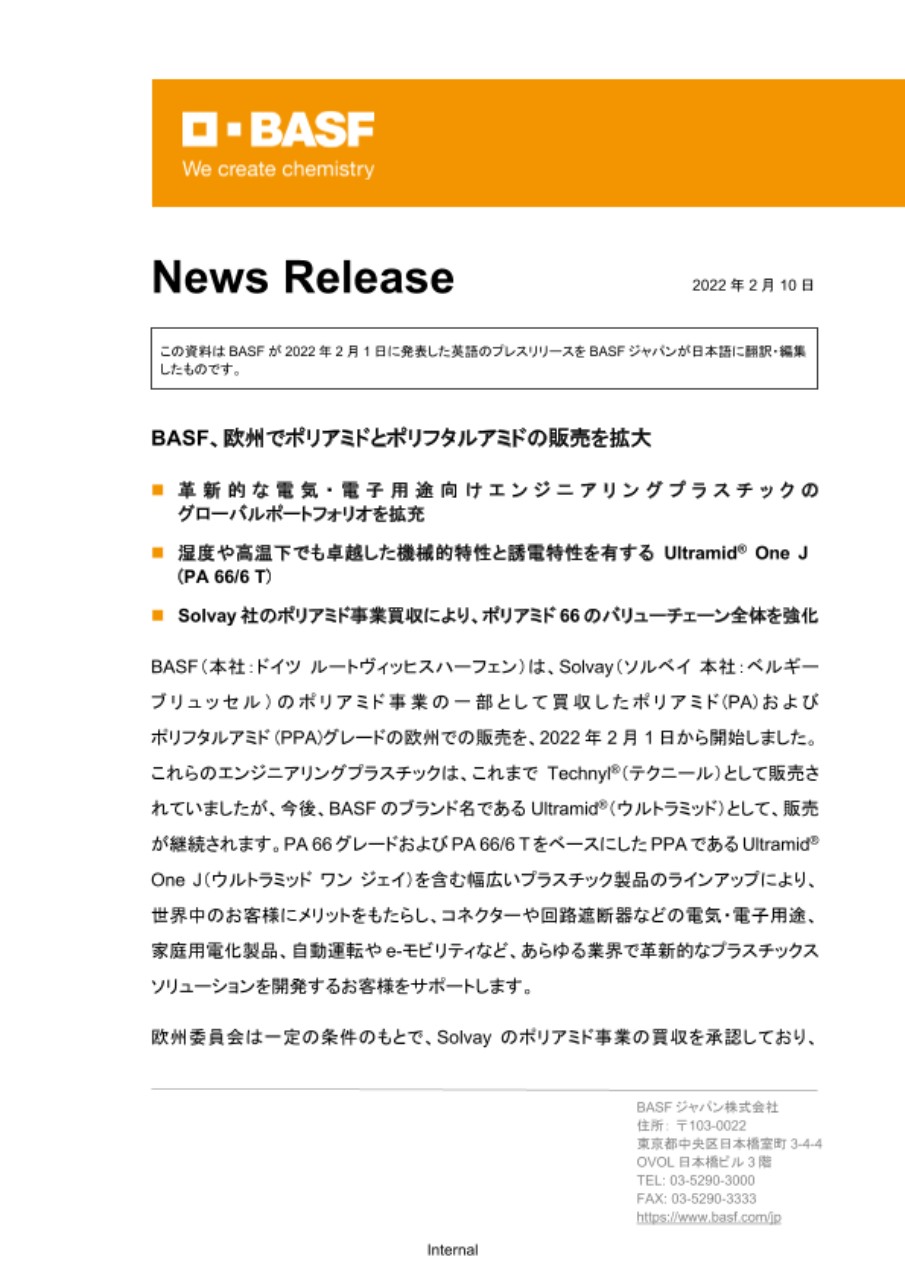BASF(本社:ドイツ ルートヴィッヒスハーフェン)は、Solvay(ソルベイ 本社:ベルギー ブリュッセル)のポリアミド事業の一部として買収したポリアミド(PA)およびポリフタルアミド (PPA)グレードの欧州での販売を、2022年2月1日から開始しました。これらのエンジニアリングプラスチックは、これまでTechnyl®(テクニール)として販売されていましたが、今後、BASFのブランド名であるUltramid®(ウルトラミッド)として、販売が継続されます。PA 66グレードおよびPA 66/6 TをベースにしたPPAであるUltramid® One J(ウルトラミッド ワン ジェイ)を含む幅広いプラスチック製品のラインアップにより、世界中のお客様にメリットをもたらし、コネクターや回路遮断器などの電気・電子用途、家庭用電化製品、自動運転やe-モビリティなど、あらゆる業界で革新的なプラスチックスソリューションを開発するお客様をサポートします。