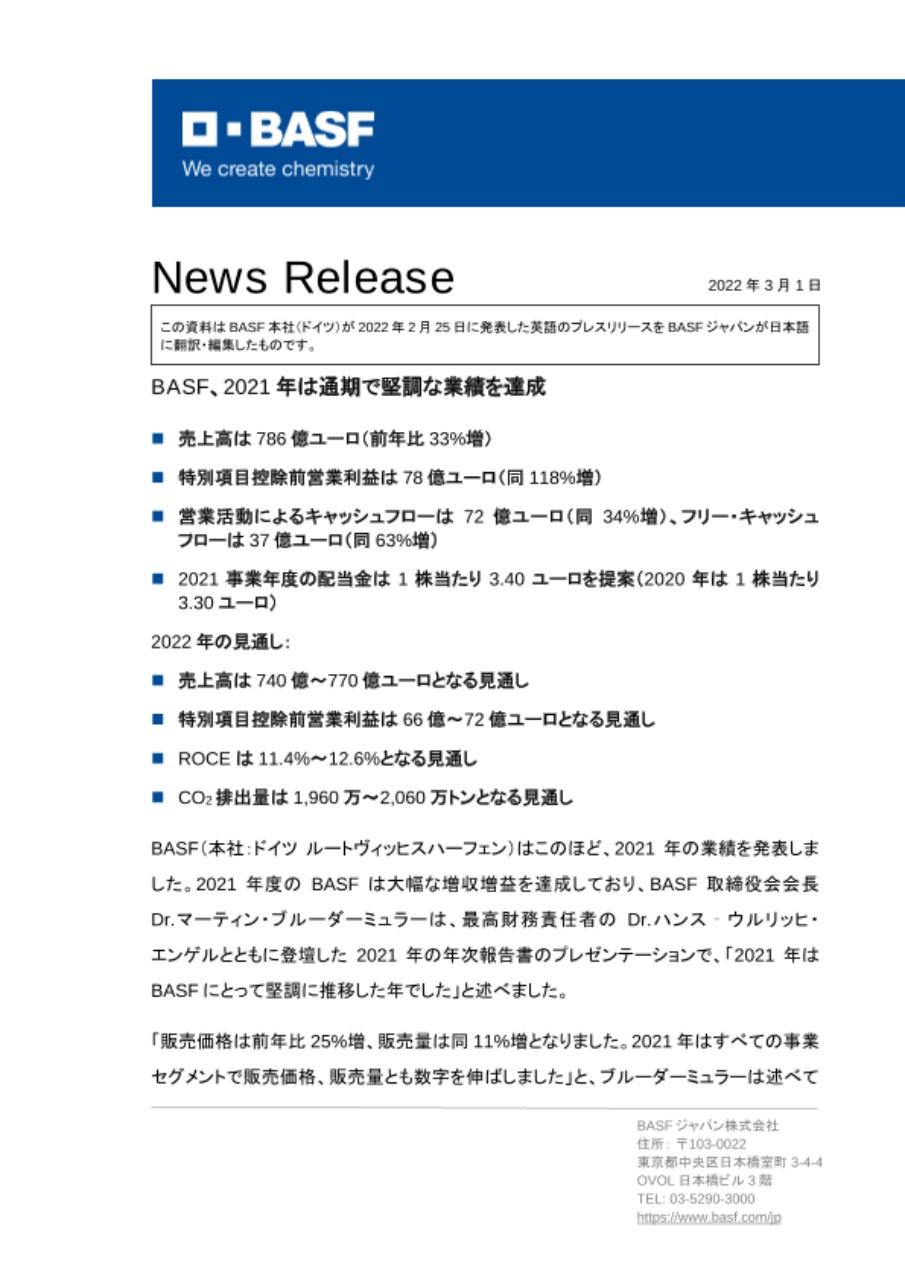 この資料は BASF本社(ドイツ)が 2022年02月25日に発表した英語のプレスリリースをBASFジャパンが日本語に翻訳・編集したものです。