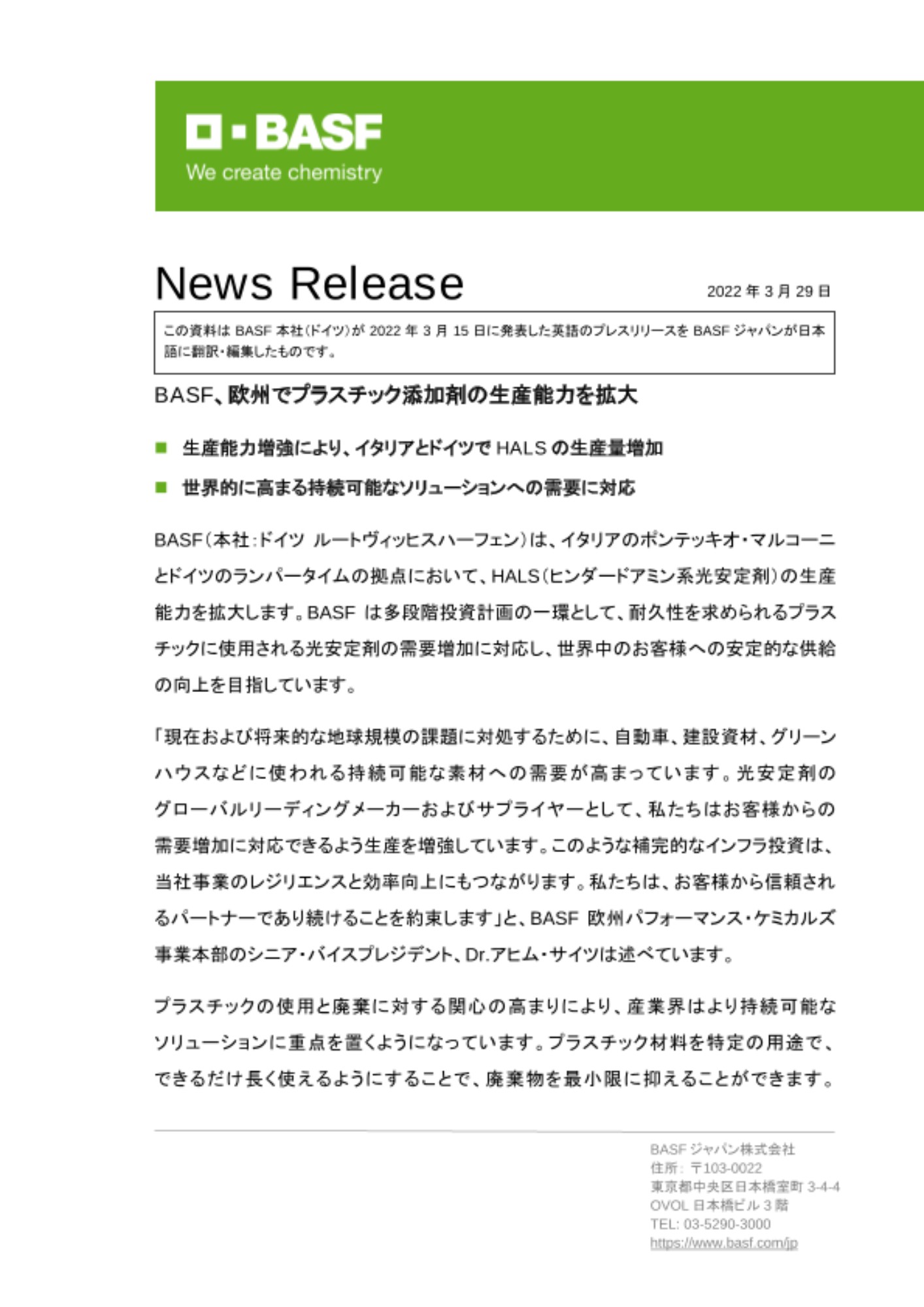 この資料はBASF本社(ドイツ)が2022年3月15日に発表した英語のプレスリリースをBASFジャパンが日本語に翻訳・編集したものです。