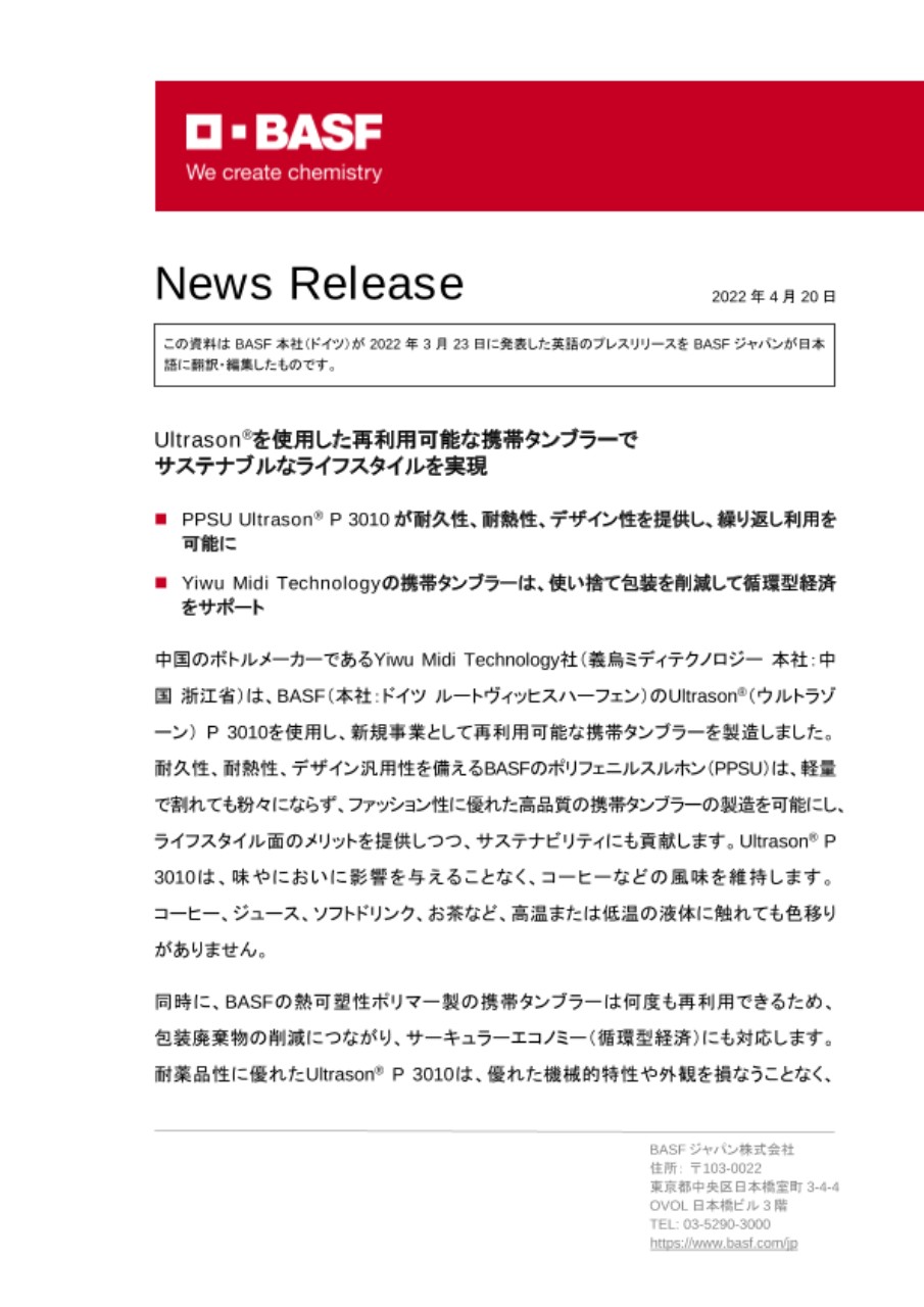 Ultrason® P 3010は中粘度の射出成形および押出成形用グレードで、-30℃から180℃という広い温度帯で温度に依存しない物性を備えており、米国、EU、中国の食品接触規格に準拠しています。BASFのグローバルビジネスディベロップメントUltrason®担当者であるゲオルグ・グレッセルは、次のように述べています。「市販の携帯タンブラーの多くは、使い捨ての素材で作られているか、高温に耐性がなかったり、割れやすいガラスで作られていたり、あるいはデザインの自由度に欠けるスチール製であったりします。優れた強度と耐薬品性を備えたBASFのPPSUは、このような既存の素材に代わる高性能かつ持続可能な素材です。お客様のデザインの自由度が向上し、消費者の皆さんは長期間にわたり使用できるので、毎日のテイクアウトコーヒーを誰もが安心して楽しめるようになります。」