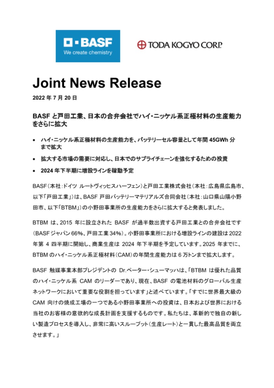 BTBMは、2015年に設立されたBASFが過半数出資する戸田工業との合弁会社です(BASFジャパン66%、戸田工業34%)。小野田事業所における増設ラインの建設は2022年第4四半期に開始し、商業生産は2024年下半期を予定しています。2025年までに、BTBMのハイ・ニッケル系正極材料(CAM)の年間生産能力は6万トンまで拡大します。
