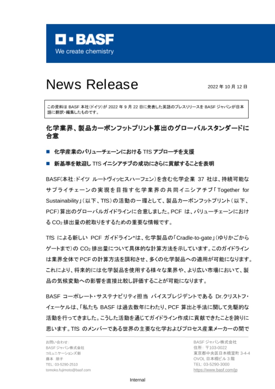 BASFコーポレート・サステナビリティ担当 バイスプレジデントであるDr.クリストフ・イェーケルは、「私たちBASFは過去数年にわたり、PCF算出と手法に関して先駆的な活動を行ってきました。こうした活動を通じてガイドライン作成に貢献できたことを誇りに思います。TfSのメンバーである世界の主要な化学およびプロセス産業メーカーの間で結ばれた業界全体の合意により、PCFの無制限の比較可能性と、化学業界における公平な競争条件の達成に大きく近づくことができます」と述べています。