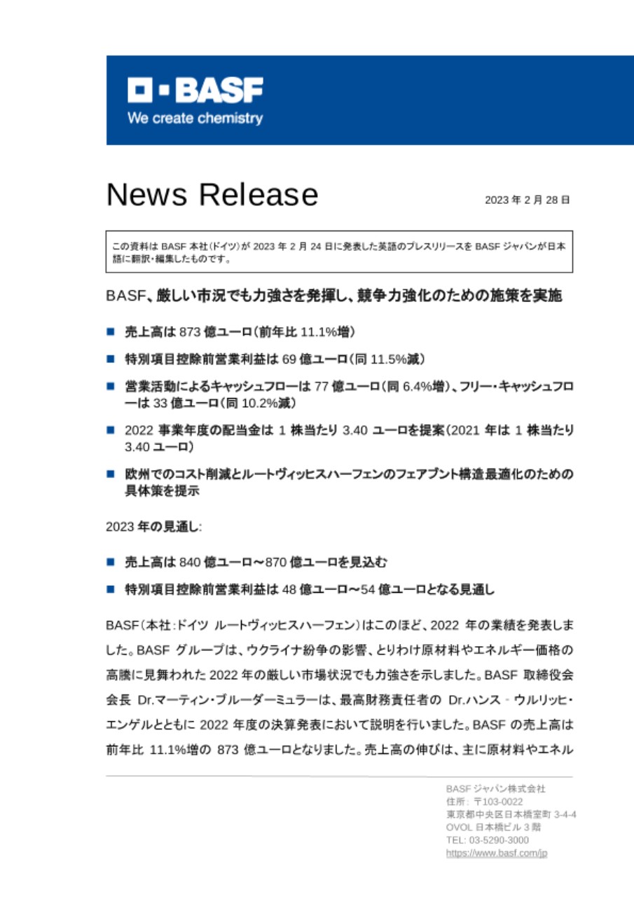 BASF(本社:ドイツルートヴィッヒスハーフェン)はこのほど、2022年の業績を発表しました。BASFグループは、ウクライナ紛争の影響、とりわけ原材料やエネルギー価格の高騰に見舞われた2022年の厳しい市場状況でも力強さを示しました。BASF 取締役会会長Dr.マーティン・ブルーダーミュラーは、最高財務責任者のDr.ハンス‐ウルリッヒ・エンゲルとともに2022年度の決算発表において説明を行いました。BASFの売上高は前年比11.1%増の873億ユーロとなりました。売上高の伸びは、主に原材料やエネルギー価格の高騰により、ほぼすべての事業セグメントで価格が上昇したことによるものです。マテリアル事業セグメントおよびケミカル事業セグメントで最大の価格上昇がありました。また、BASFグループ全体では、販売量の大幅減が売上の伸びを鈍化させました。販売量の減少は主に、サーフェステクノロジー事業セグメントおよびケミカル事業セグメントの売上減に起因しています。