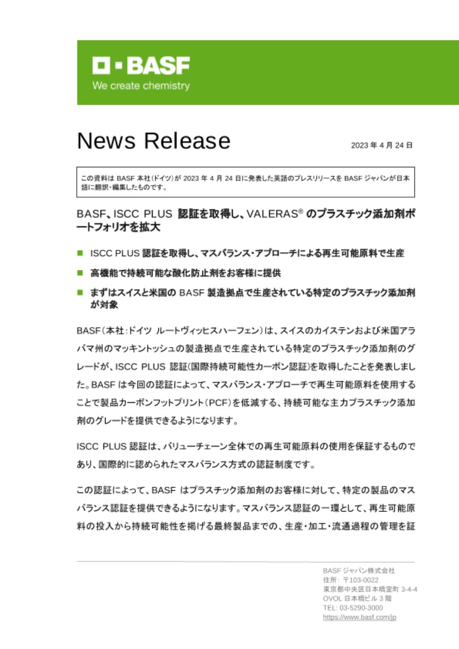 BASFプラスチック添加剤担当のシニア・バイス・プレジデントであるDr.アヒム・サイツは、次のように述べています。「BASFはVALERAS®(バレラス)ポートフォリオを拡大し、プラスチック添加剤サプライヤーとして初めてバイオマスバランス認証済みの酸化防止剤のセレクションを提供することになりました。お客様は、化石資源の代わりに責任を持って調達された再生可能原料を使用し製造された、より持続可能で且つ高機能な酸化防止剤を選択できるようになりました。私たちはお客様やパートナーとともにプラスチックの新しい価値を創出しながら、持続可能性に大きく貢献するイノベーションを推進しています。」